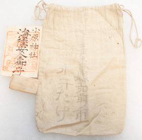 Rare WWII Japanese 19th Regt, 1st Landing Harita Group, 2nd Unit, 2nd Army Supply Boat Crew Mt Maeda Masao Sennabarri Belt & Carrying Bag. About six by forty-two inches. Cotton body with red exposed stitches. Has one good luck coin attached. Roughly translated it reads 19th Regt, 1st Landing Harita Group, 2nd Unit, 2nd Army Supply Boat Crew Mt Maeda Masao. Has a shrine stamp that says SEA LAND SAFETY. Also included is a small comfort bag, paper shrine stamp and a talisman. This is the first one we have ever owned to a boat unit. Has been folded but still in great shape. PCR