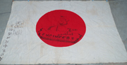 WWII 32nd Combat Engineers Captured Japanese Flag. Flag is about fifty-six by sevety-eight inches. Thin cotton body with a machine sewn "Sun" in the center. An artists has hand drawn the patch design of the 32nd Combat Engineers. Great detail even down to the Australian made knuckle knife. The corners are re-enforced with leather and still have the rope tie downs. On the lower left are some names written in Japanese. When I had a translation done it was a couple of unkind words about the Americans who had it done. Probably drawn right at the end of the war. Has been used but still in great shape. Wish I had a wall in the showroom where I could properly hang this.