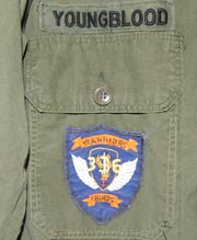 Vietnam 336th Aviation Badged Fatigue Shirt. Private purchase, poplin material. Shirt sleeve with two chest pockets. On the shoulder is a VN machine embroidered 1st Aviation brigade. On both sleeves are VN hand mebroidered spec 4 ranks. On left chest is a m.e. Army strip with machine emb. aircrew wings above. On the pocket is a VN m.e. 13th Aviation Battalion patch. On the right chest is his name and a hand embroidered 336th Aviation Thunderbirds pocket patch. Shirt has been worn but is still in great shape.