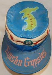 1950's US Air Force 6461st Troop Carrier Squadron KYUSHU GYPSIES Painted Field Cap. Cut out of a 51 pattern fatigue cap. It has been painted to give it a stiff "Castro" like appearance. On the top is a map of Korea, and on the front is a set of CAPT bars and KYUSHU GYPSIES. On one side are some Korean characters, and on the other the likeness of the sqaudron patch. Inside you can still read instructions for the cap. Great shape, but a little dusty from storage. Small size.