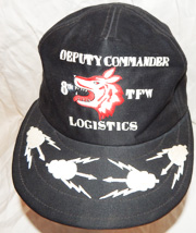 Vietnam Era US Air Force 8th Tactical Fighter Wing Deputy Commander Theatre Made Ball Cap. Black cotton body with six panels. Directly embroidered in the front is a wolf's head with DEPUTY COMMANDER 8TH TFW LOGISTICS. On the bill are clouds and lightning bolts. Around the hat is direct embroidered 71 UBON 72 THAILAND BILL WASHINGTON. Inside is a faint stamp of the tailor shop in Thailand that made the cap. Looks unworn. This is a stunning cap.