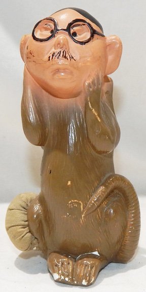 WWII Home Front Anti-Axis Hitler / Tojo Rat Pin Cushion Figure. Stands about five and a half inches tall. One side is Hitler with his arms placed like he is thinking. When you turn it around it is then Tojo holding his face. On one side is a padded pin cushion. Shows some minor paint chipping along bottom, otherwise great. Have not seen another one like this. ROR