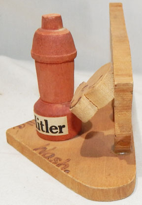 WWII Home Front Anti-Axis Wooden Dog Peeing On Hitler Figure. About four inches long by three inches tall. Wooden carved dog with its hind leg lifting on a fire plug. On the plug is ADOLPH HITLER . Wood burned into the base is WALLA WALLA WASH. Have not seen another like this one. Great shape. VCT