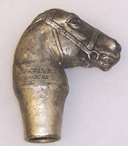 Japanese Army Retired Cavalry Officers 14th Horse Riding Ceremony 1938 Cane Topper. About three inches tall. Silver colored metal finish. Has characters on each side of the horse's neck. Shows very minor use. Neat piece.