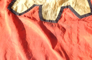 Late 1930's - WWII German DAF Exemplary Factory Flag. Roughly 47 by 54 inches in size. Heavy red, silk like background. Has a machine sewn twisted gold fringe border on three sides. The fourth side still has the metal rings for hanging. The gold cog is made out of a coarse material that feels like bullion but it isn't, the black border is ribbed silk. The center is a white silk like material with a silver bullion swastika in the center ( can never remember the name of this type bullion but you see it on collar tabs). This flag has been hung and used and shows some minor staining and a few small seperations in the material. There is also a small section of fringe missing. This sat in a attic of a local house for many years until it was brought to our showroom.