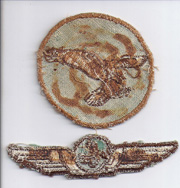 WWII Army Air Forces / Civilian Pilot Training Program Falcon Field Patch & Wing Set. Patch is machine embroidered on a turquoise twill background with a cheesecloth like backing. The wing is embroidered on the same color twill. Both have been used and also removed from a scrapbook. Hard patches to find.