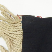WWII German Trumpet Banner For DJ element in Reichsgau Oberdonau ( Hitler's Birthplace). About twenty-one by nineteen inches. Two sided. The front is cotton wide wide bullion embroidered details to the eagle and the white stripes. Has a white twisted frine border on three sides. The back side is black cotton with a white machine embroidered single rune. Across the top still remian two of the three hangers, as one fell off a long time ago. This came right out of a veteran's estate, and it looks like the veteran let his kids play with it at one time as there are some pink marks on the top of the rune. Has been stored for a long time. What city could be better then the birthplace of Hitler for a youth flag.....