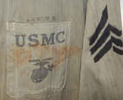 WWII Identified US Marine Corps 41 Pattern HBT Shirt. Standard issue, hbt cotton body. Three pocket cut. Has the Marine emblem stencilled on pocket. Above the pocket is the Marines name. Has hand drawn SGT chevrons on both sleeves. Inside, on the back is his name written in ink. Has been worn. Probably a medium size. Probably just post-WWII with the name the way it is above the pocket.