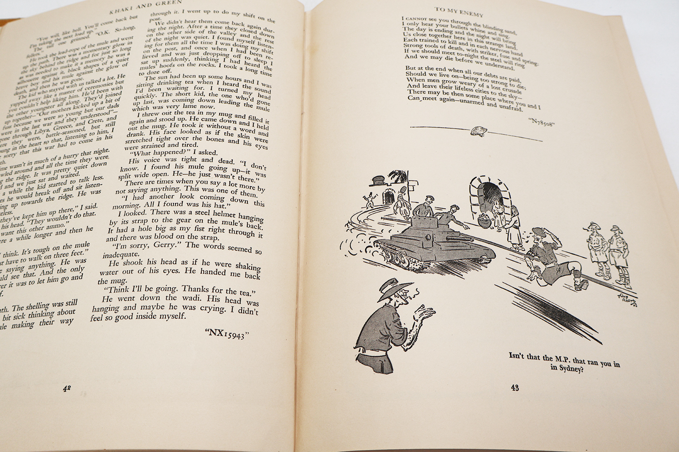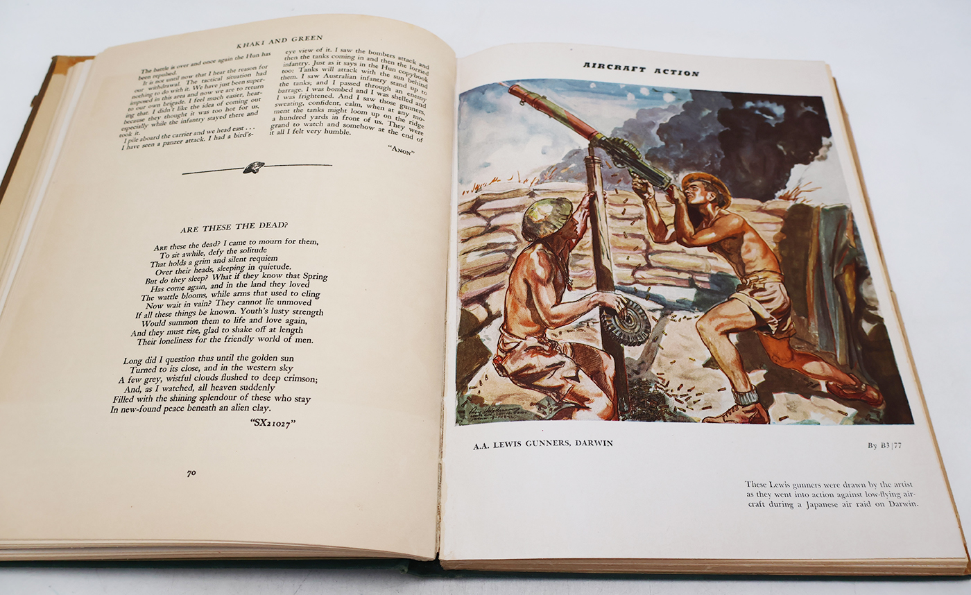 WWII era Khaki and Green: With The Australian Army at Home and Overseas Unit History. The book cover, dust jacket and pages are worn with age, but the binding is strong. No torn or missing pages. The book is 1943 dated. First Edition. Well Illustrated. The book contains approx. 204 pages.