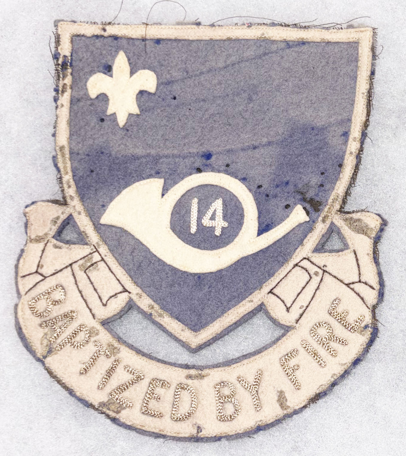 Pre-WWII 187th Field Artillery Wool Pocket Patch. Seven inches tall. Mutli-piece wool construction with chain stitched details. Has been used and is faded.