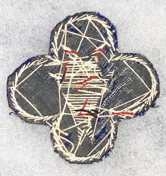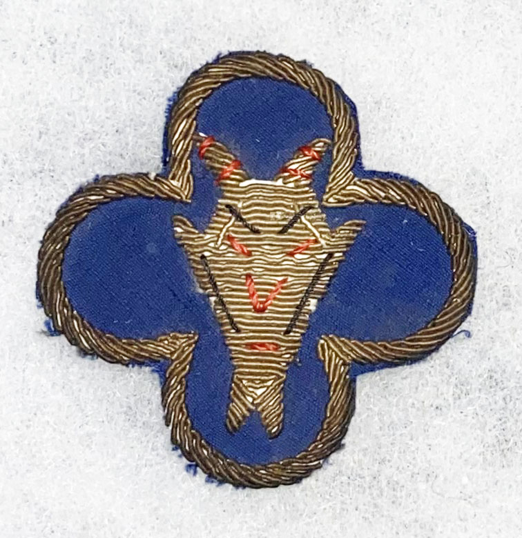 WWII 88th Division Devil Head Bullion Patch. Italian made blue wool clover with a heavy gold bullion border. In the center is a bullion devil head. Used.