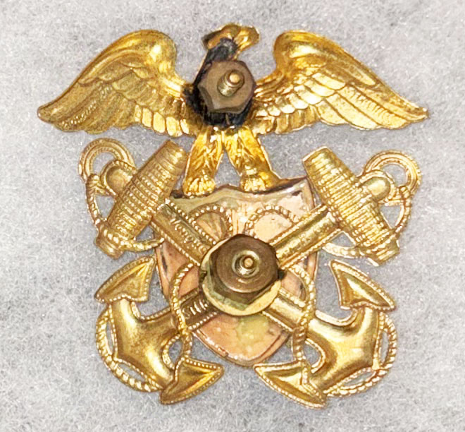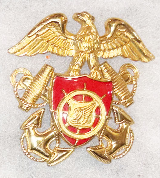 WWII US Army Transport Service / ATS Water Division Officers Cap Badge. Two and a half inches tall. Two piece construction. Gold metal body with a red enameled shield. No hallmarks. Screw back.
