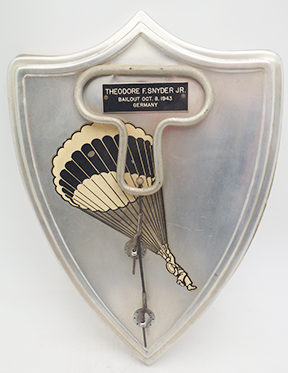 WWII era Bailout Commemorative Plaque. Aluminum plaque with an image of the man parachuting and a parachute ripcord attached to the front. Named a to an airmen who bailed out over Germany on October 8th, 1943. This was the date the 381st Bombardment Group attacked the Bremen Shipyards. Plaque is in good condition with just very minor wear from age. Measures 14 x 10 inches.