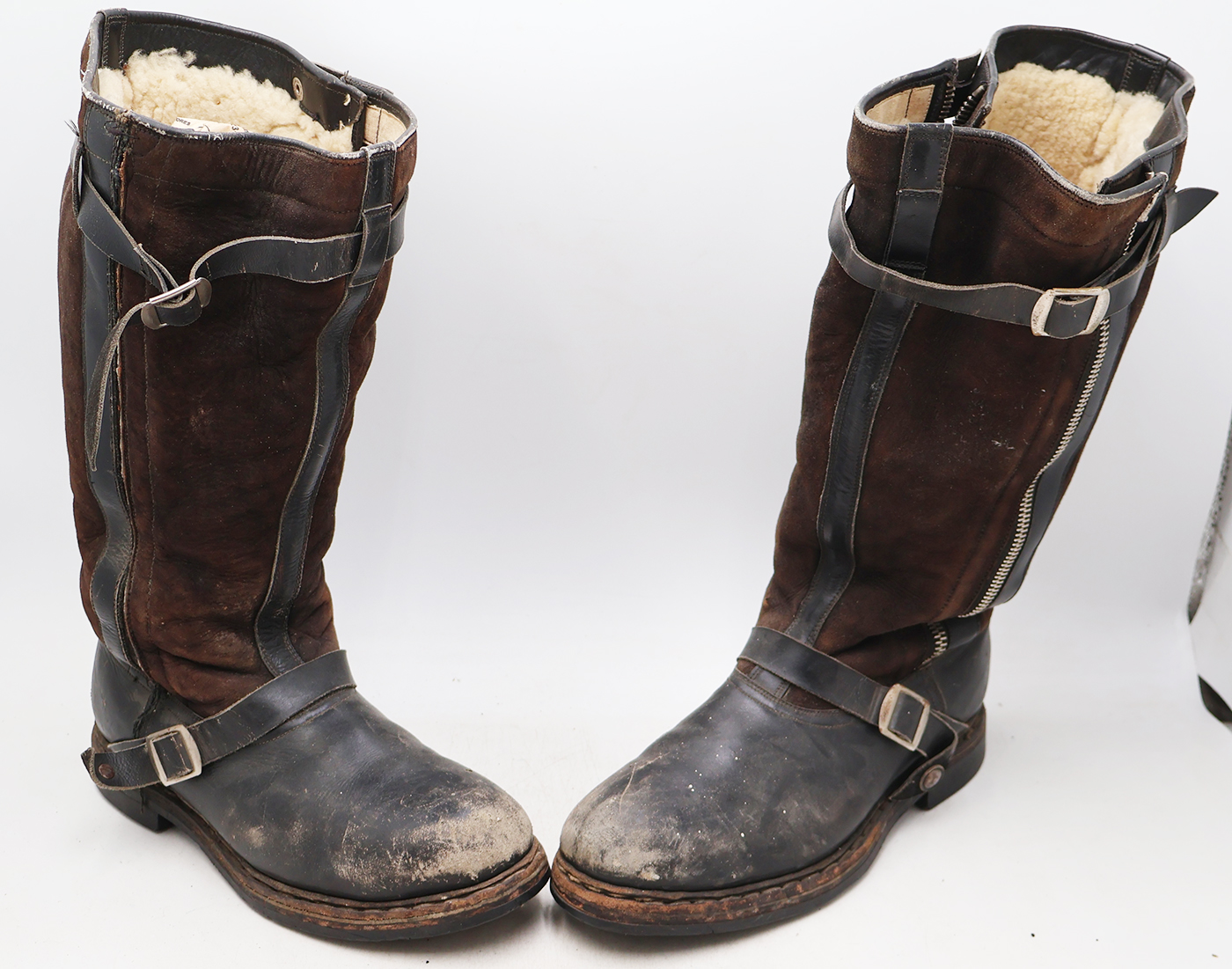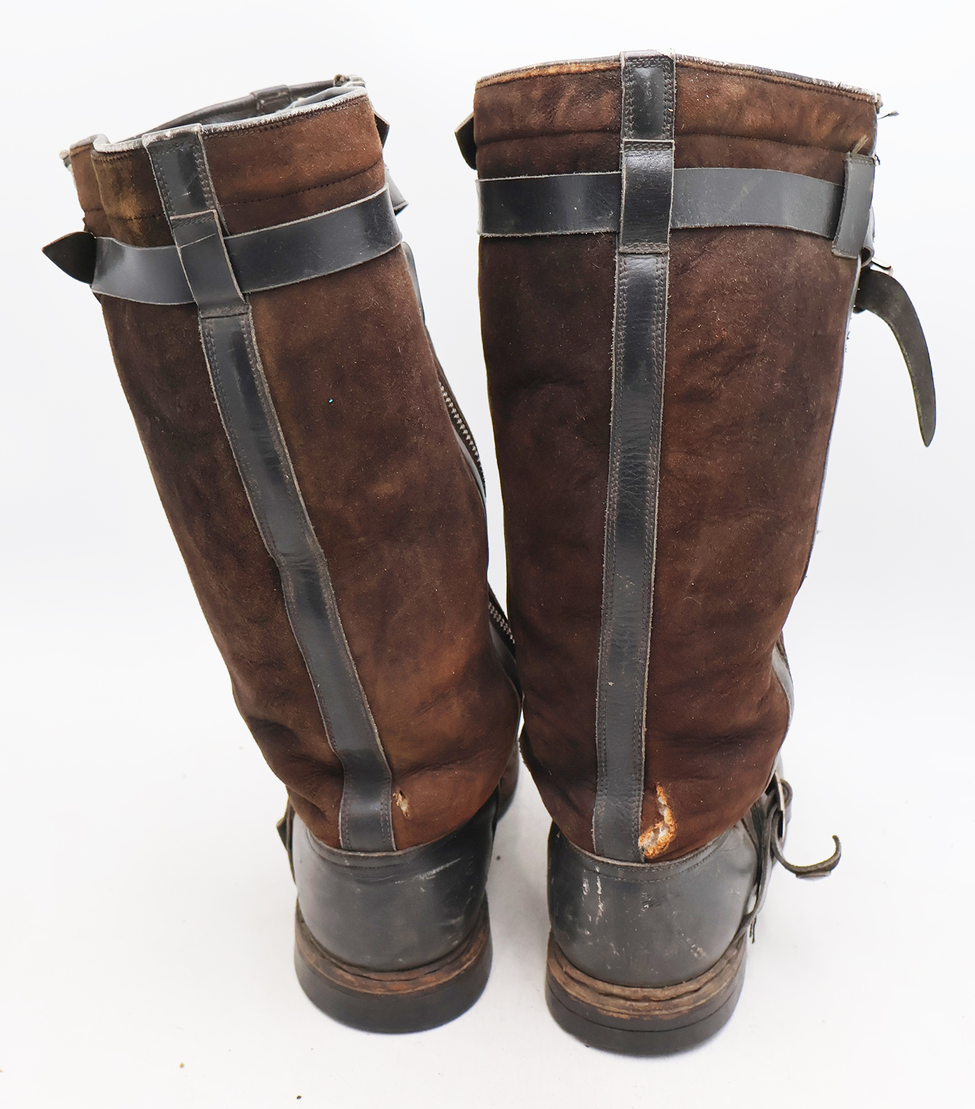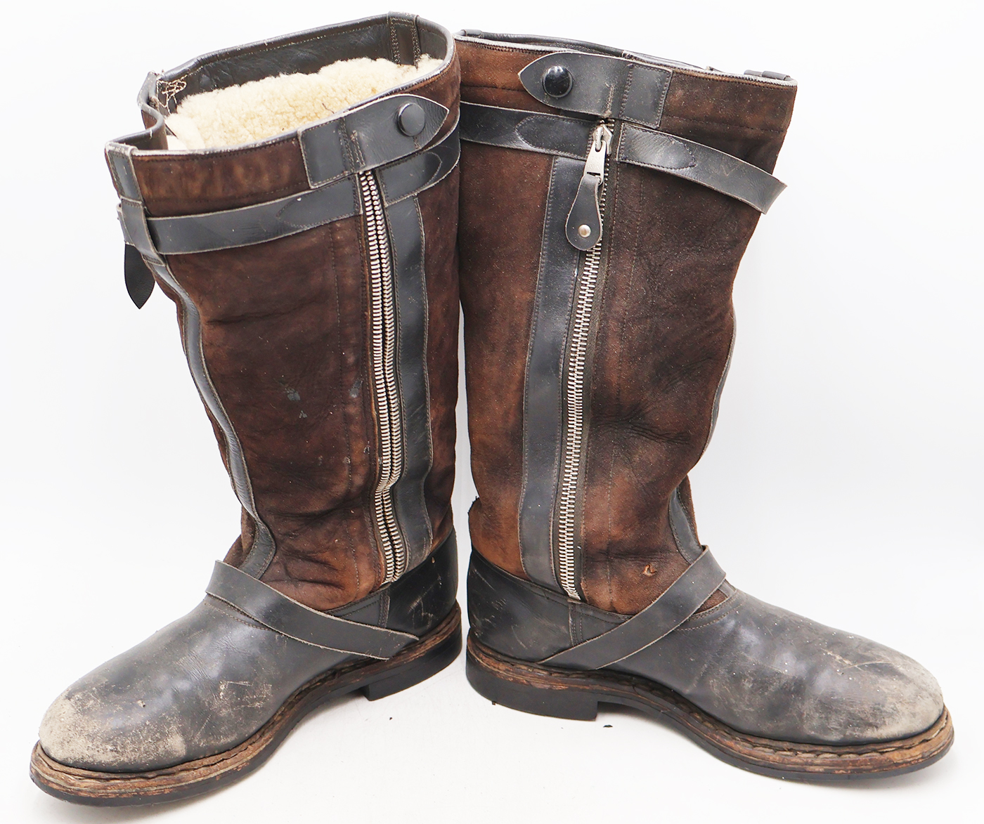 WWII era German Luftwaffe PST 4004 flight boots. Leather boots are very supple and have no notable damage except a small rip on the rear, base of the right boot (see photos). Rubber soles are intact, but stiff. Wool lining is in good shape. Zippers are in good condition. One zipper has been removed off of the outer part of the right boot in what appears to be a period repair. The boots are intact, but are still showing age and are good for display and not wear.