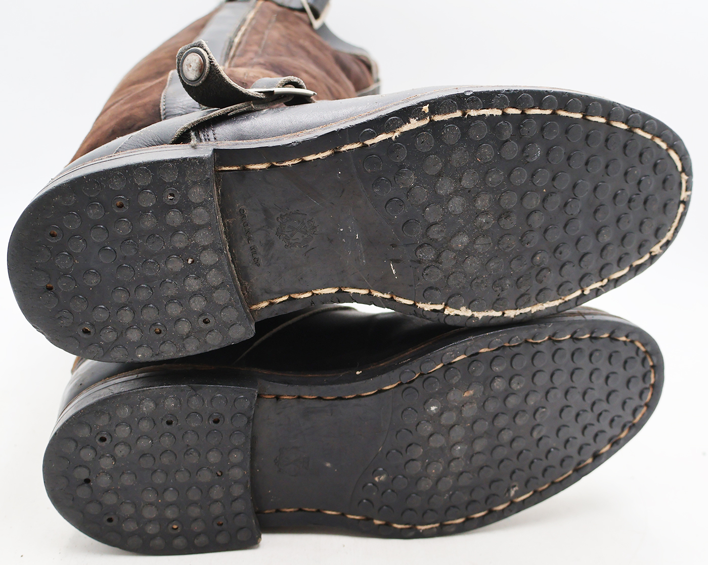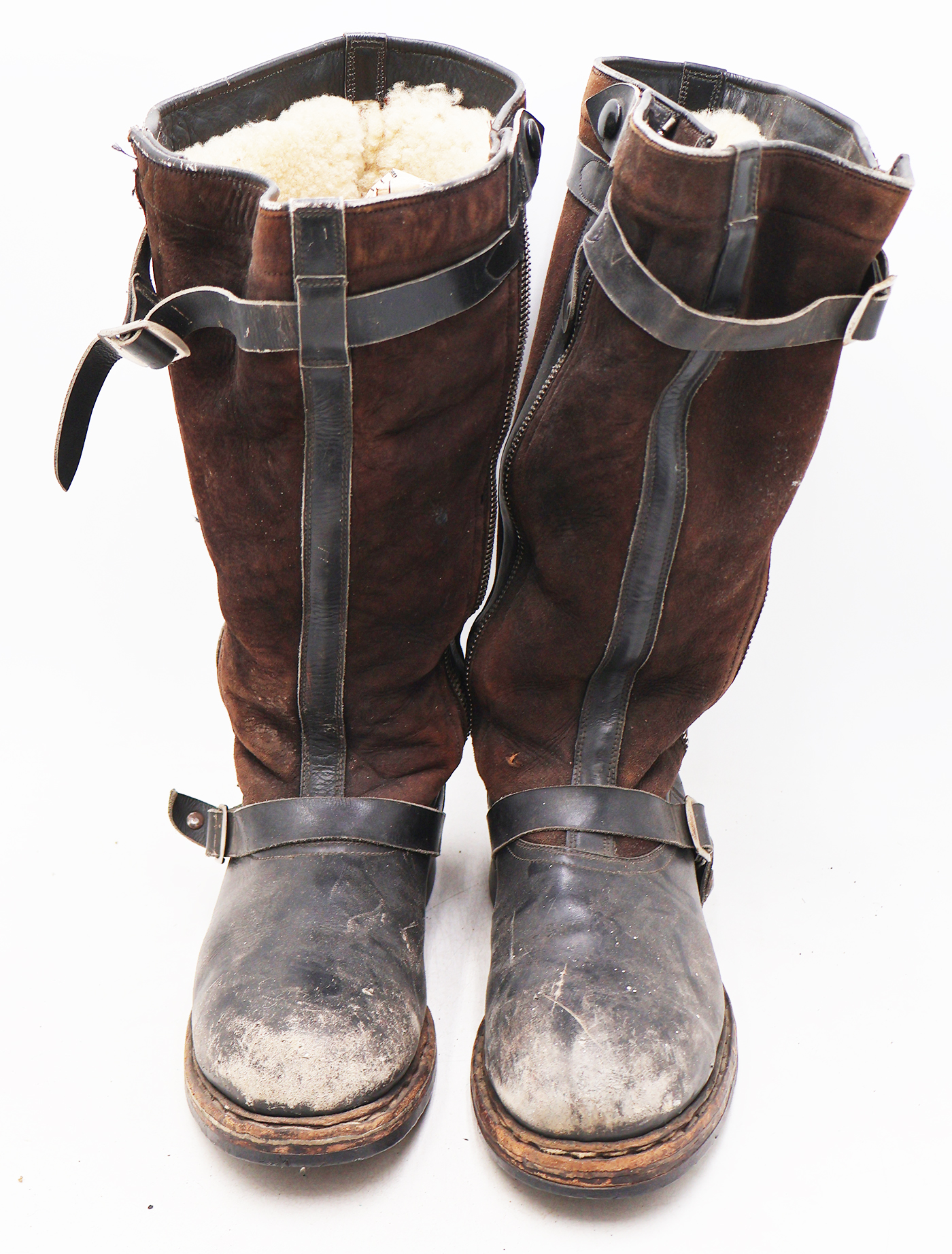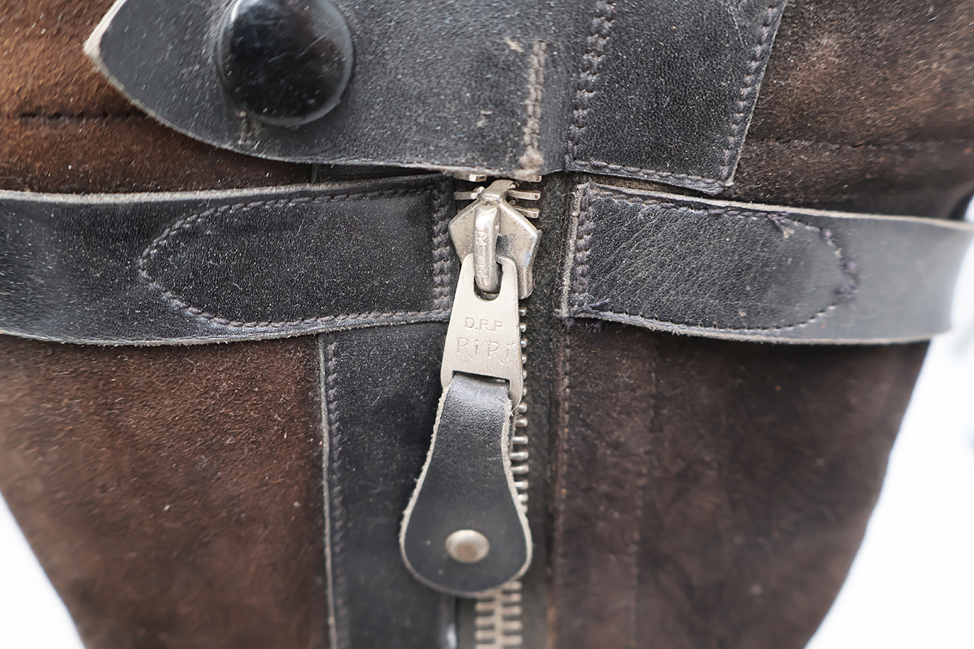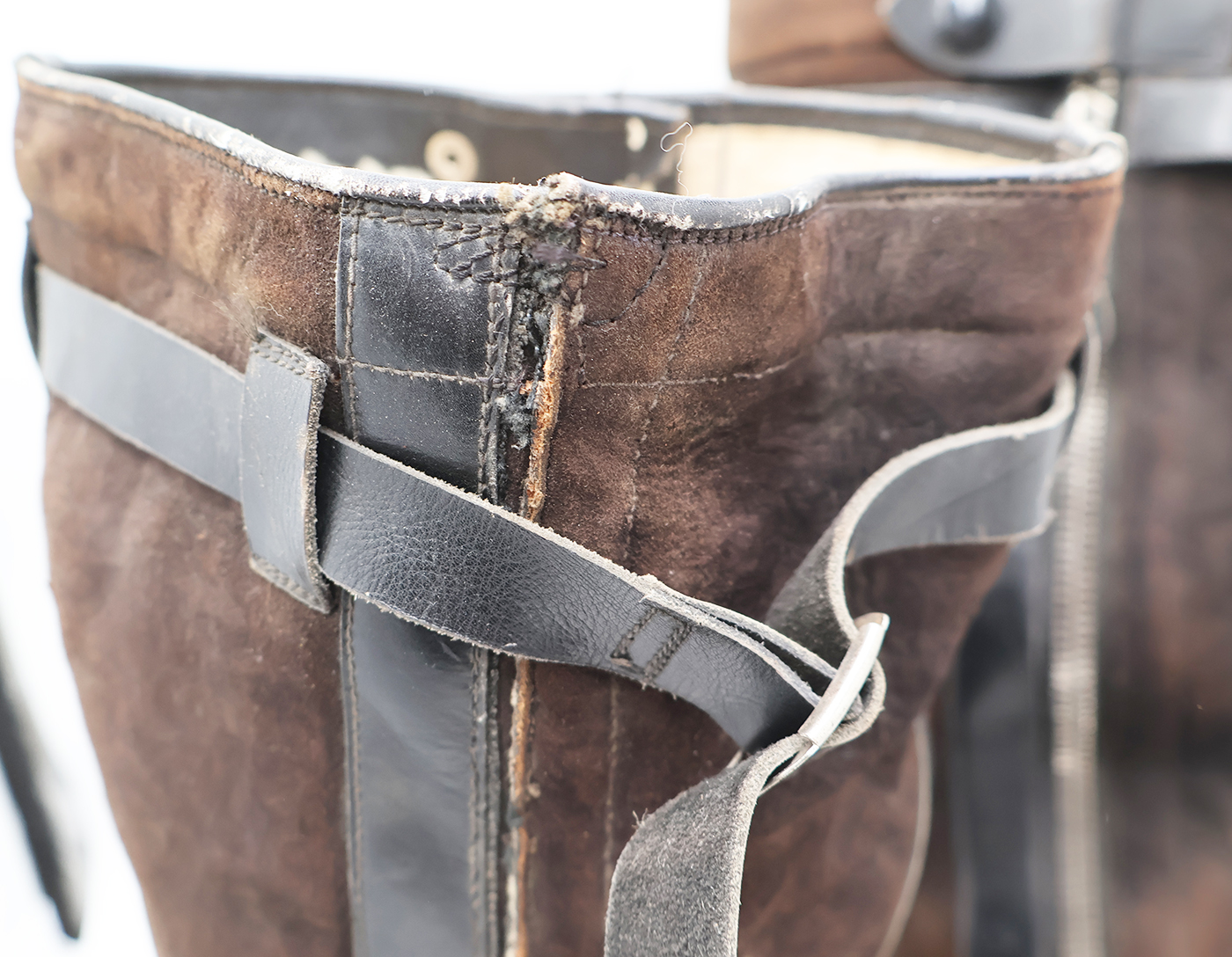 WWII era German Luftwaffe PST 4004 flight boots. Leather boots are very supple and have no notable damage except a small rip on the rear, base of the right boot (see photos). Rubber soles are intact, but stiff. Wool lining is in good shape. Zippers are in good condition. One zipper has been removed off of the outer part of the right boot in what appears to be a period repair. The boots are intact, but are still showing age and are good for display and not wear.