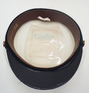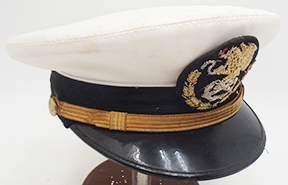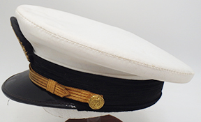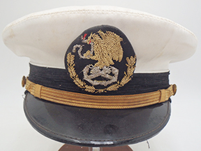 1950's or 60's Mexican Navy Officers Visor Cap. White cotton body is in good condition with some wear and staining from age. Bullion insignia is in good shape and just slightly dull. Cap bill is in good condition. Interior has minor wear, but is intact and the leather sweat band is supple. Cap is roughly a size 7. Maker’s mark is L. Cuellar.