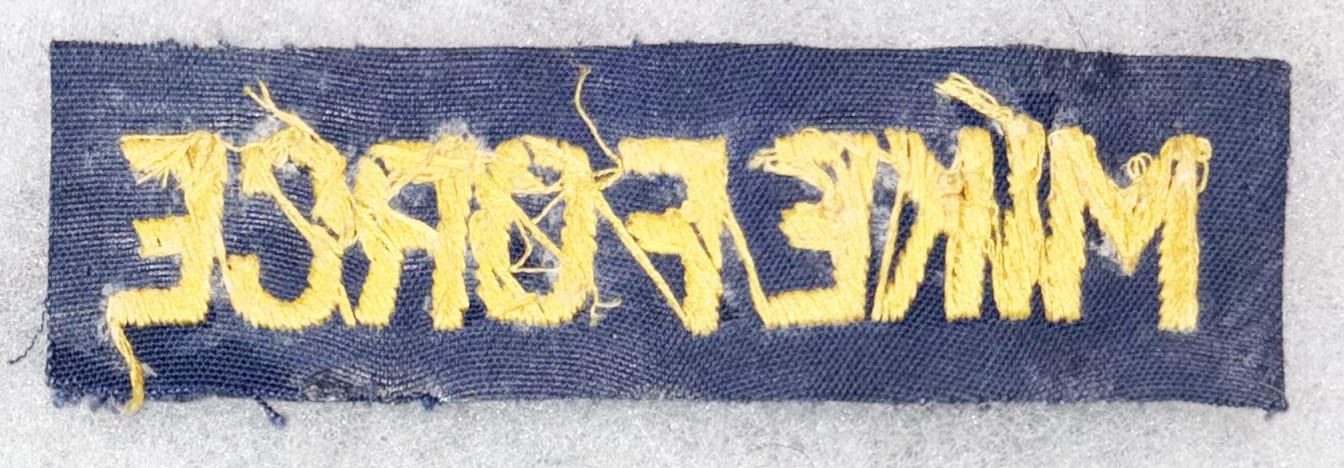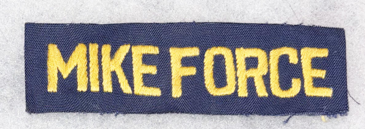 Vietnam Special Forces Mike Force Uniform Name Strip. Blue twill background with Vietnamese hand embroidered yellow details. Unused.