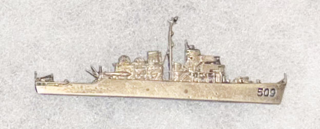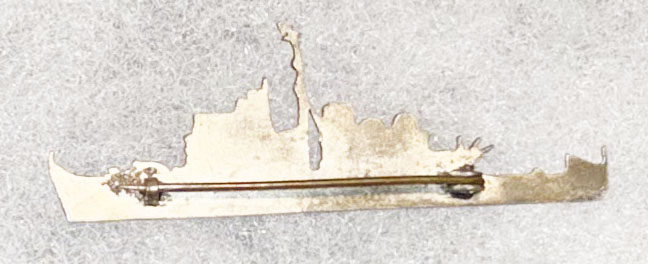WWII US Navy MSO-509 USS Adroit Ships Pin. Two and a half inches wide. Silver colored metal. No hallmarks. Appears Theatre made. Pin back with an open hook type catch.