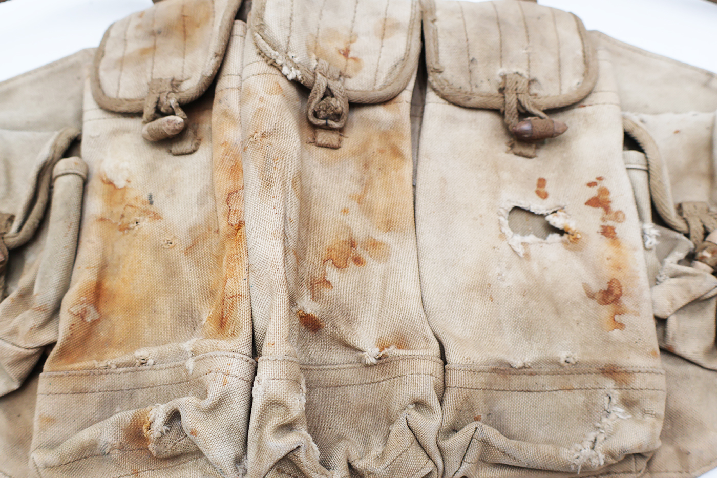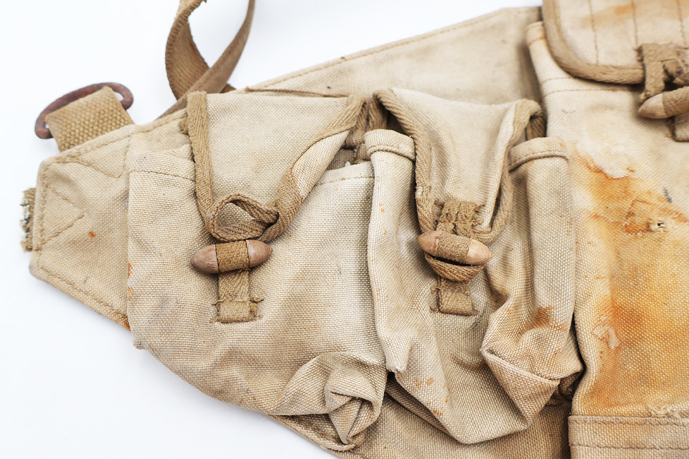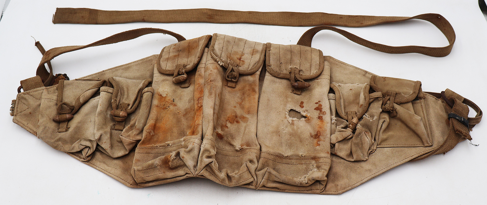 Wartime Vietnam North Vietnamese Army / NVA AK-47 Well Used Chest Pouch / Rig. Standard Chi-com type issue. Khaki canvas body with wooden toggles. Has a smaller Chinese stamp on the reverse. Has been well used and shows battle damage. This one would like killer in any display.