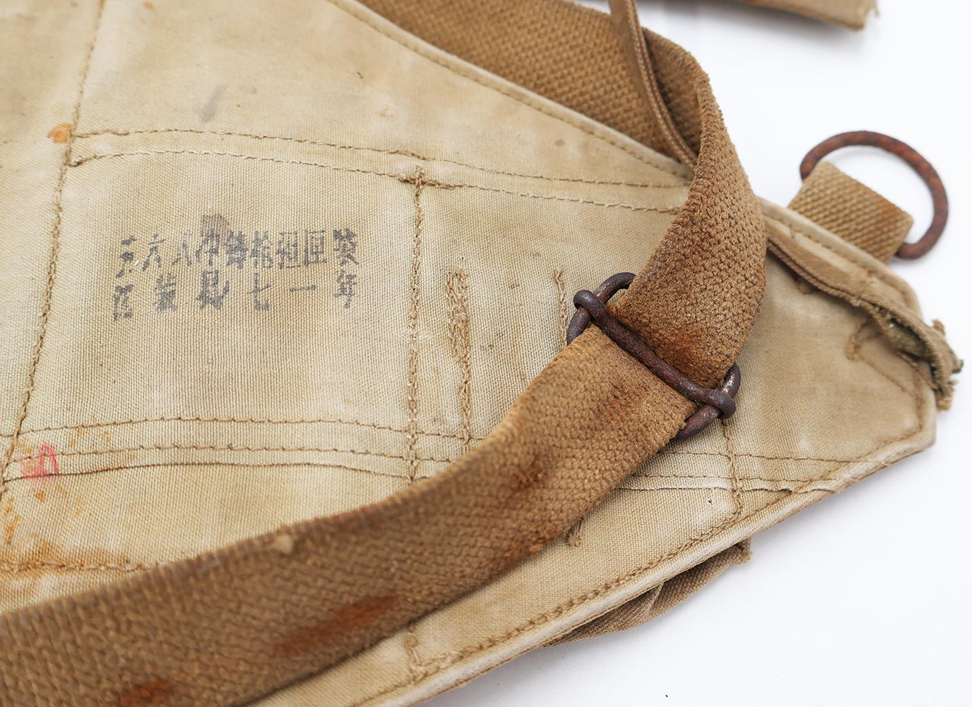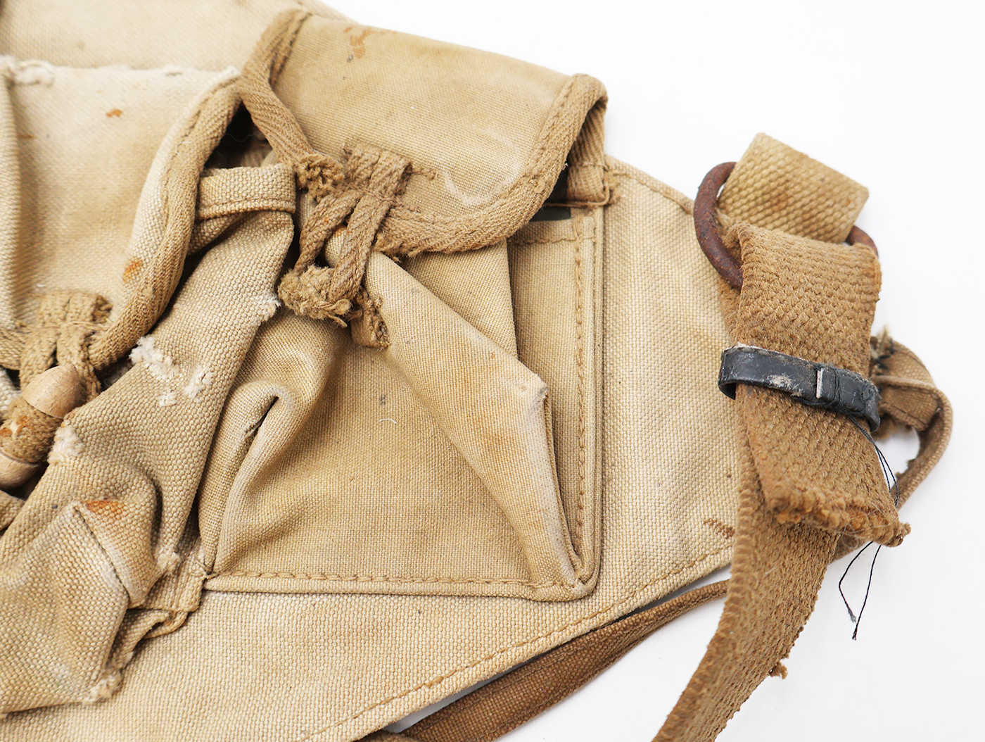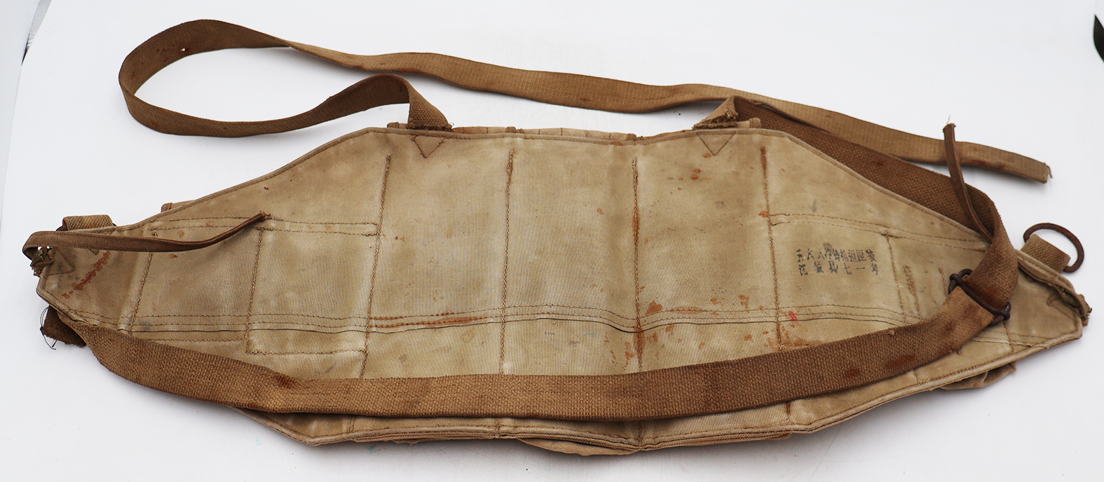Wartime Vietnam North Vietnamese Army / NVA AK-47 Well Used Chest Pouch / Rig. Standard Chi-com type issue. Khaki canvas body with wooden toggles. Has a smaller Chinese stamp on the reverse. Has been well used and shows battle damage. This one would like killer in any display.