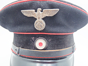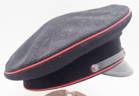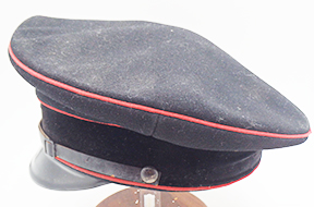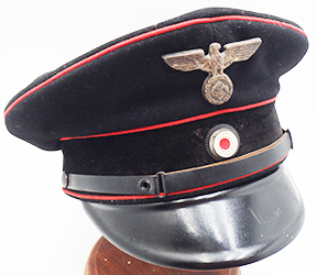 WWII German Railway Visor Cap. Black wool body is in very good condition with no notable wear or stains. Dusty from age. The leather bill is slightly detached on the left side (see photos) but is still strongly attached. Leather is in good condition. Insignia is in good shape with just some wear from age. Makers mark is clean, indicating the cap was hardly worn. Small size.