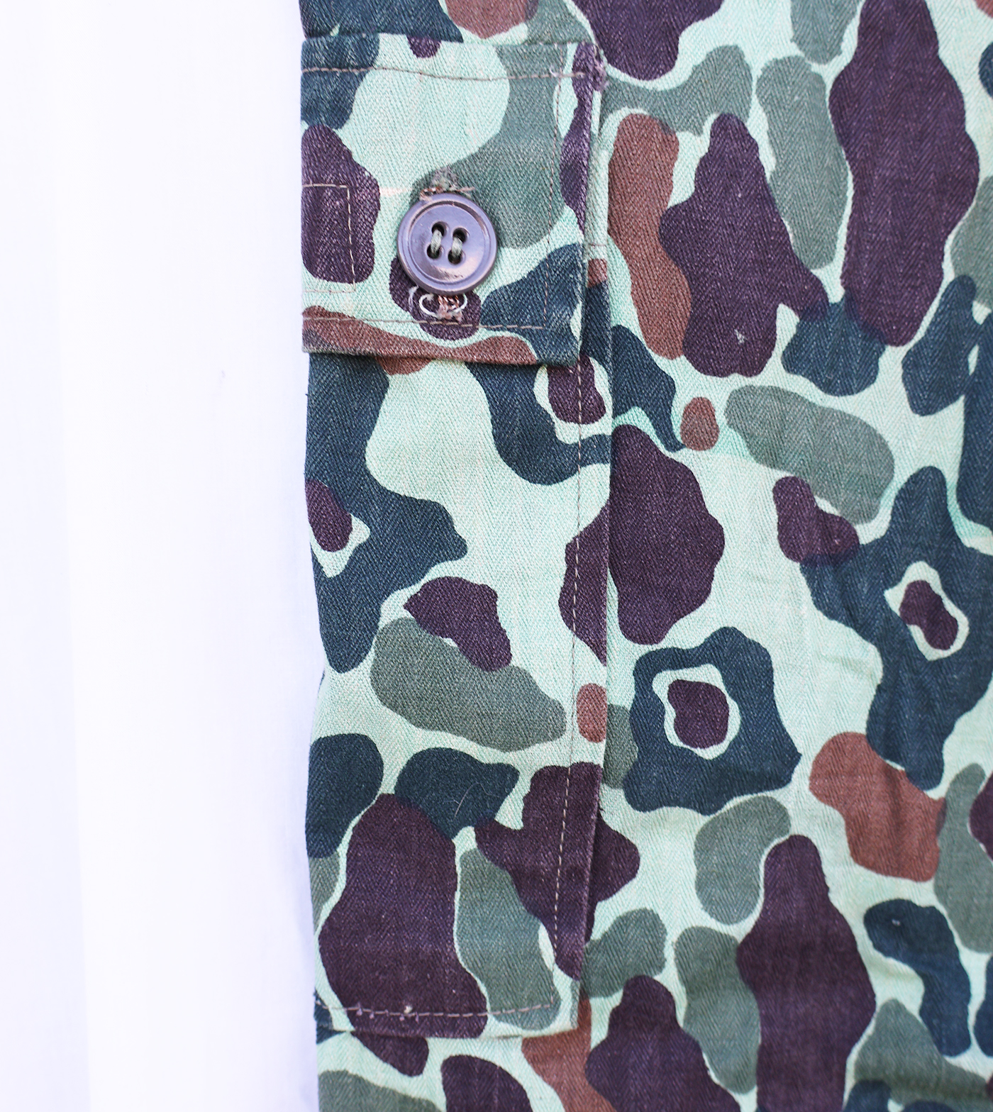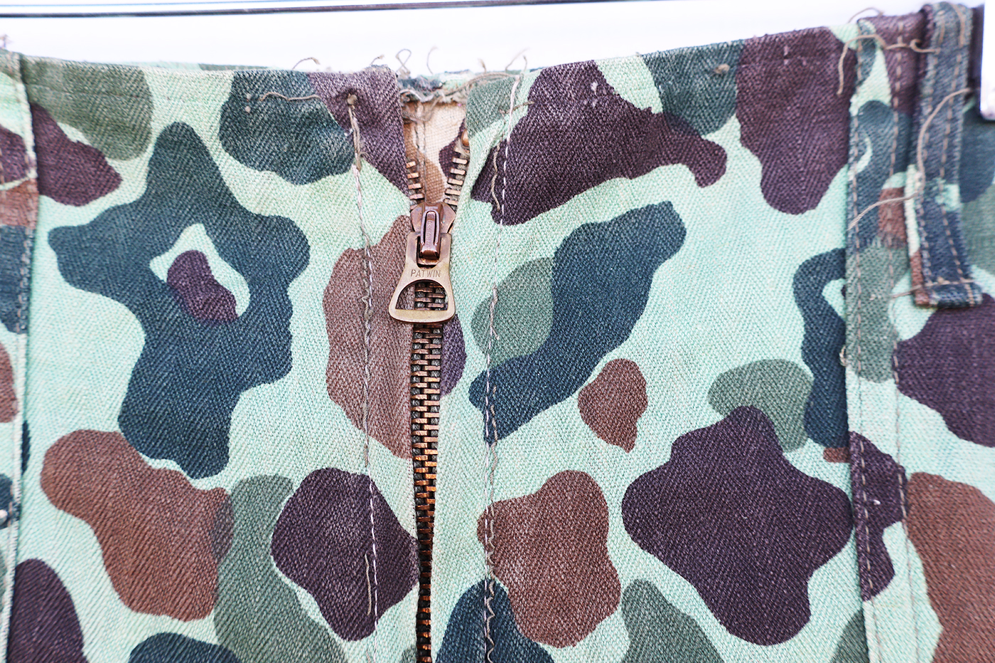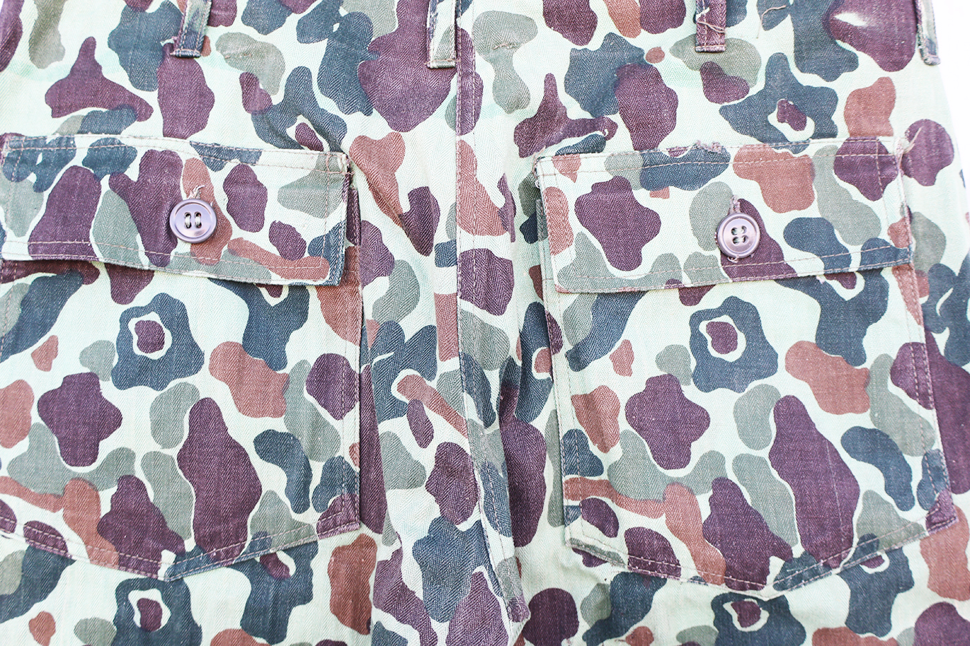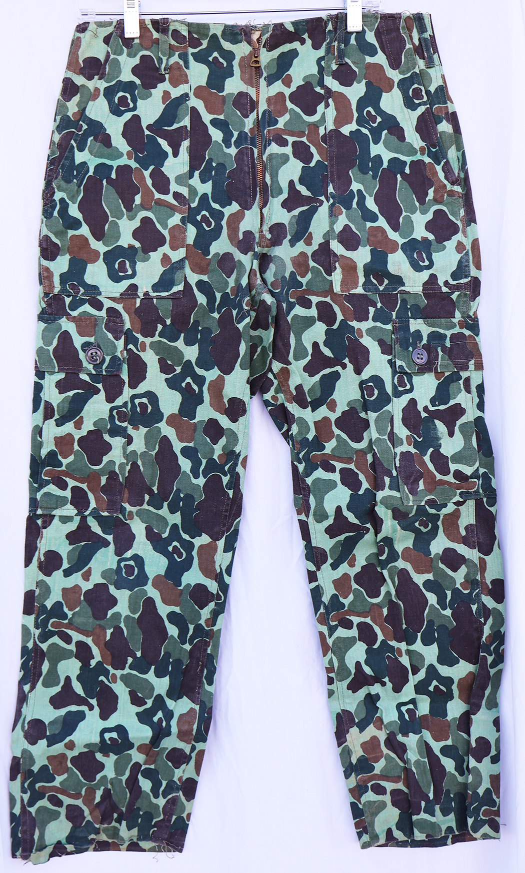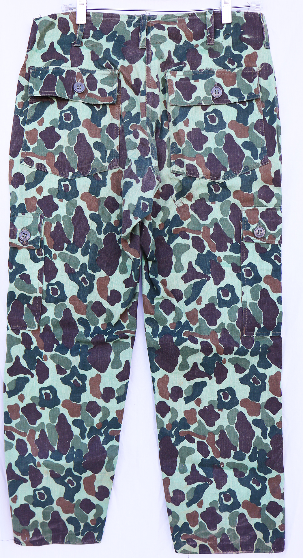 ROK Dark Green Frogskin Pattern Camo Trousers. HBT material. Two front slash pockets and two rear patch type pockets. Two hip pockets as well. Brass zipper fly works well. The waist is about a 30 inches, and the inseam from the crotch to the cuff is about 27 inches. These have been worn but are still in good condition.