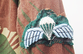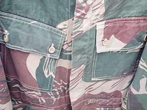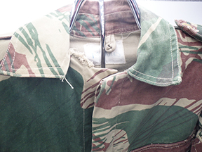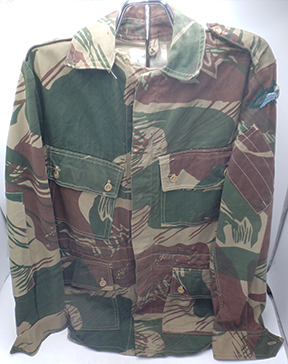 Rhodesian SAS Camouflage Smock. Smock is in good condition with some wear and staining from usage. The para wings are intact, but has some severe mothing. Named on the inside. Smock measures shoulder to shoulder 18 inches, front chest size 25 inches, sleeve length from shoulder to cuff is 25 inches and top of the neck to the base of the shirt is 35 inches.