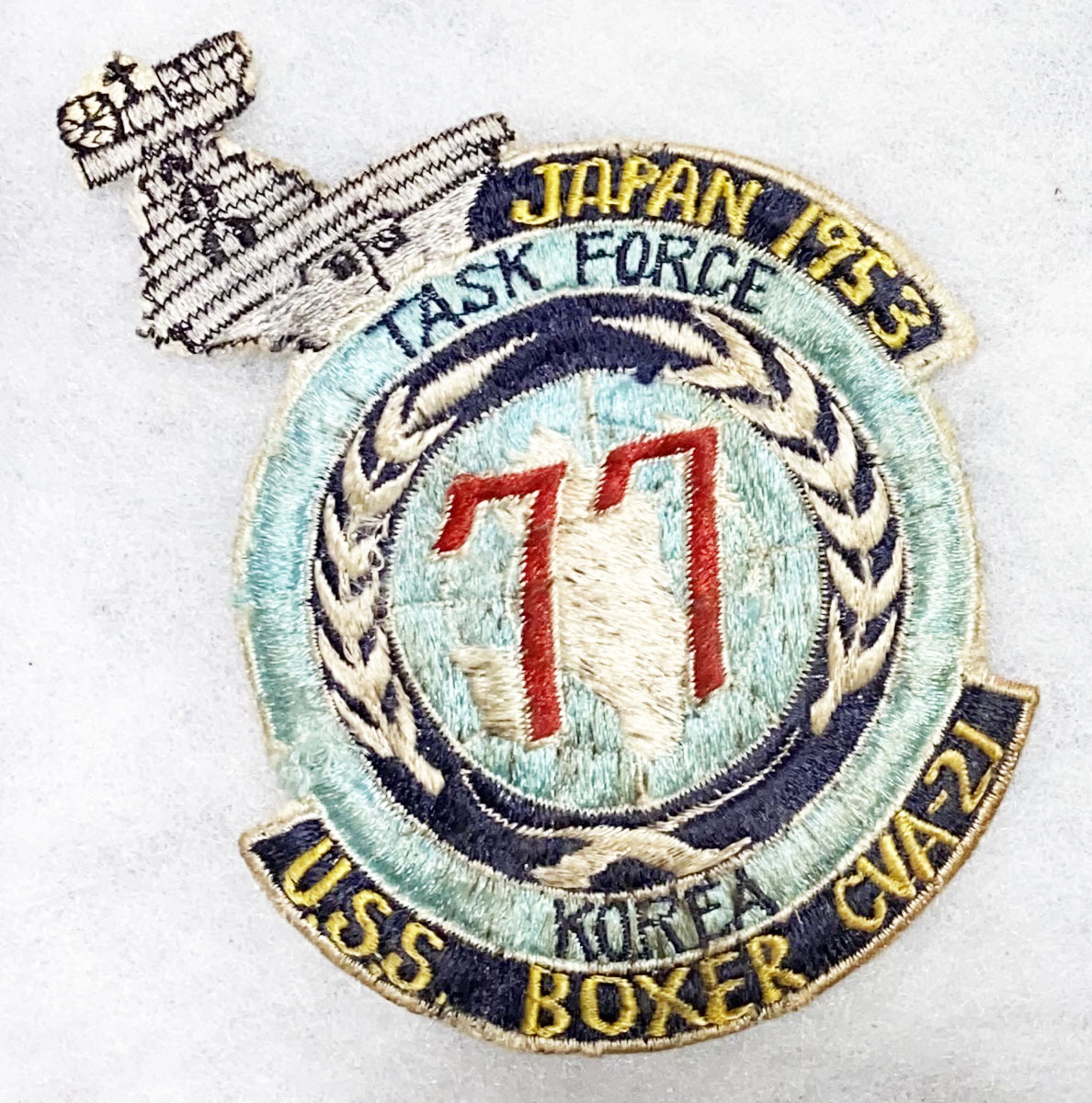 Korean War US Navy Task Force 77 USS Boxer CVA-21 1953 Cruise Patch. Five and a half inches tall. Thick Japanese machine embroidered. Used.
