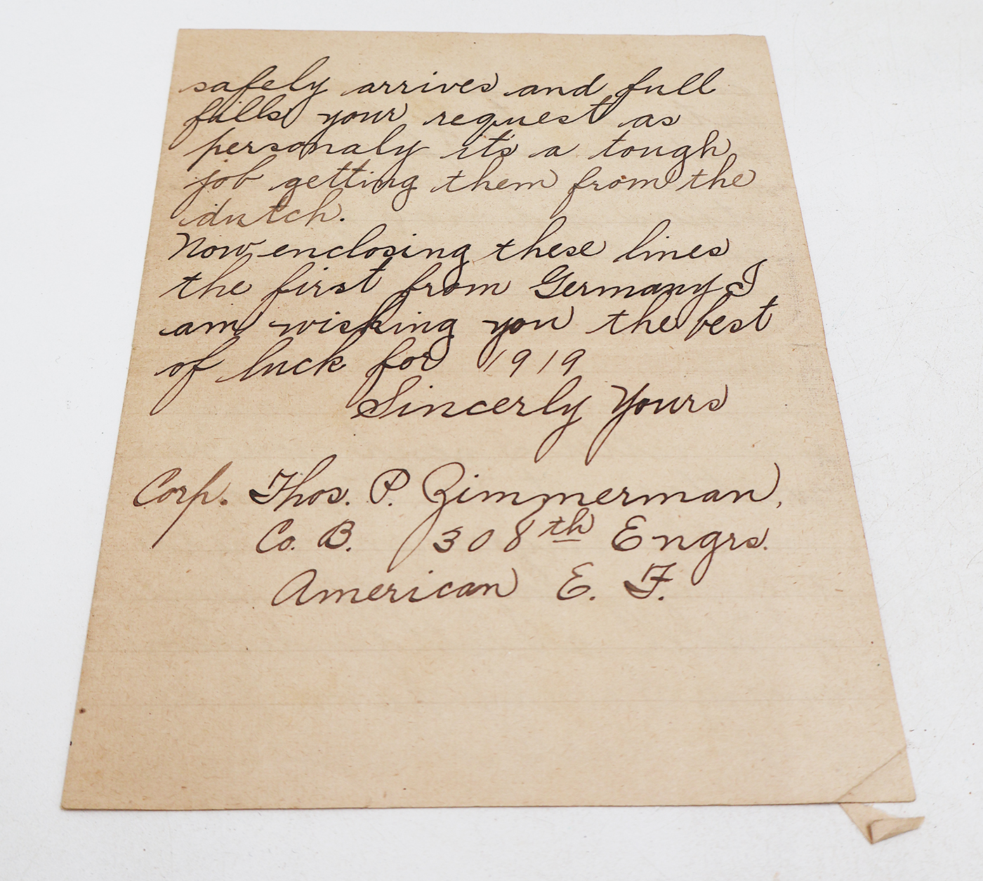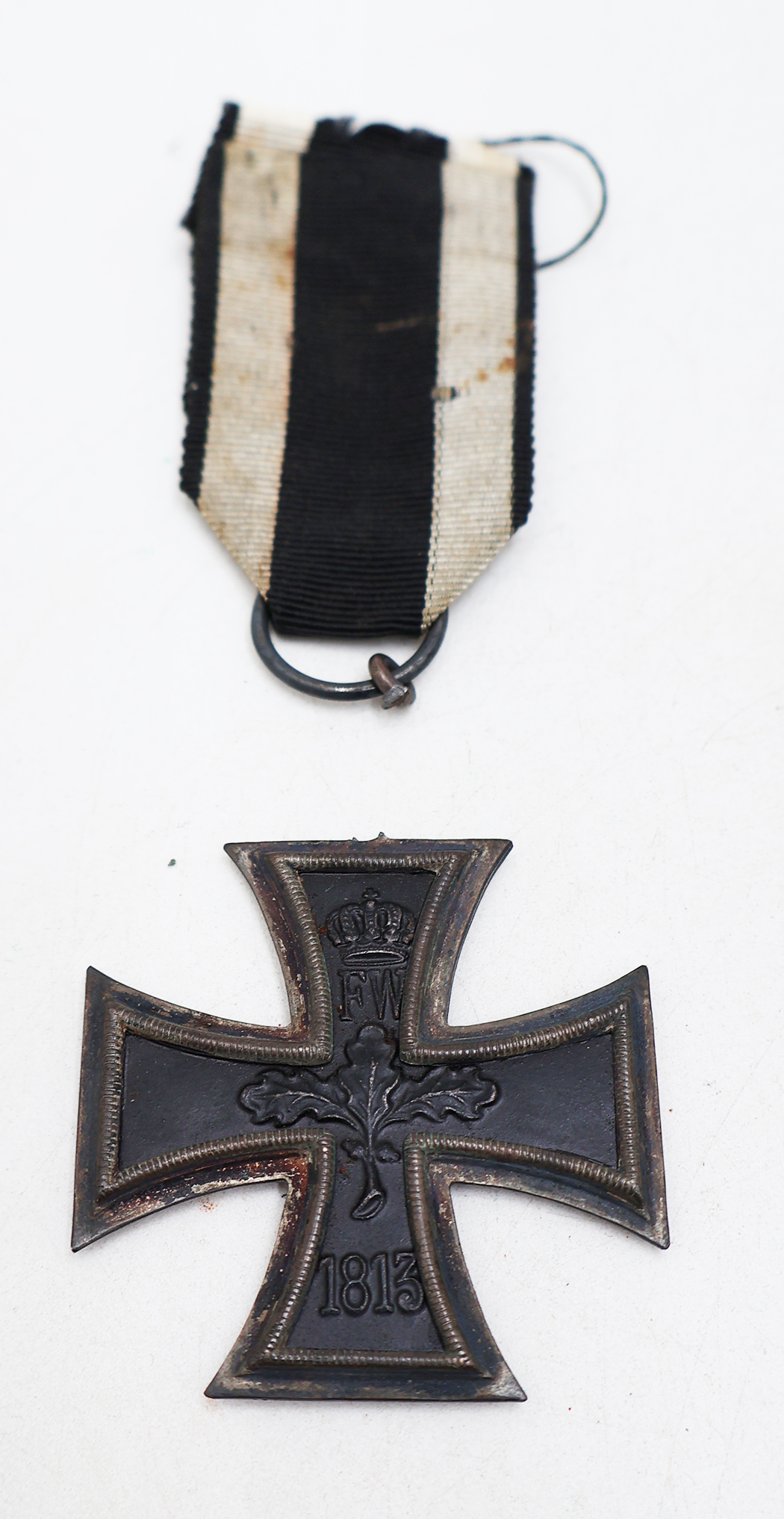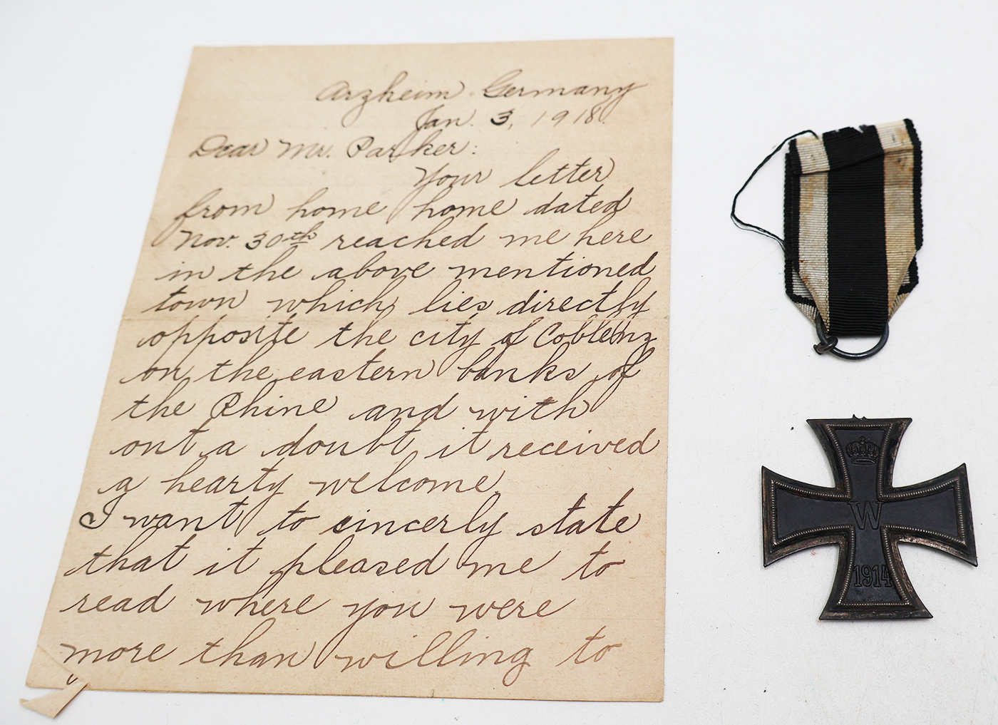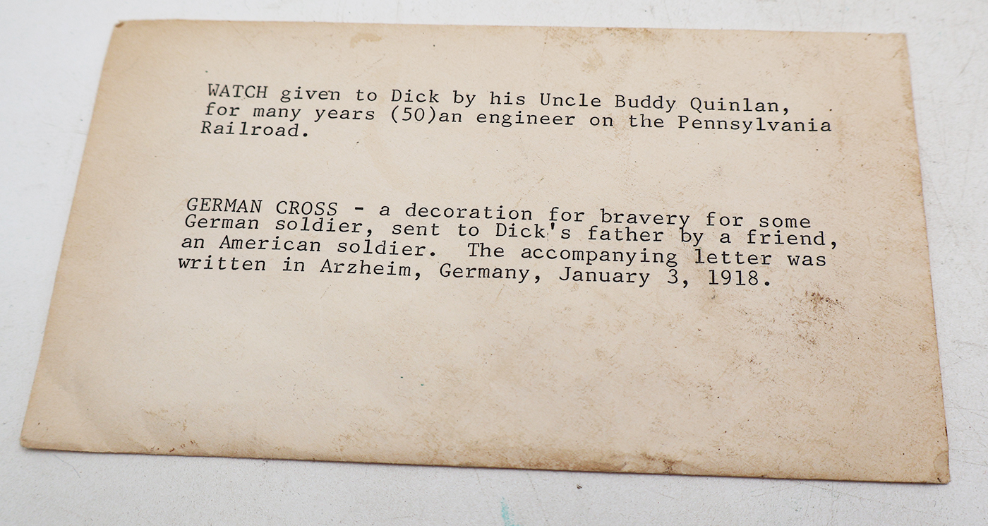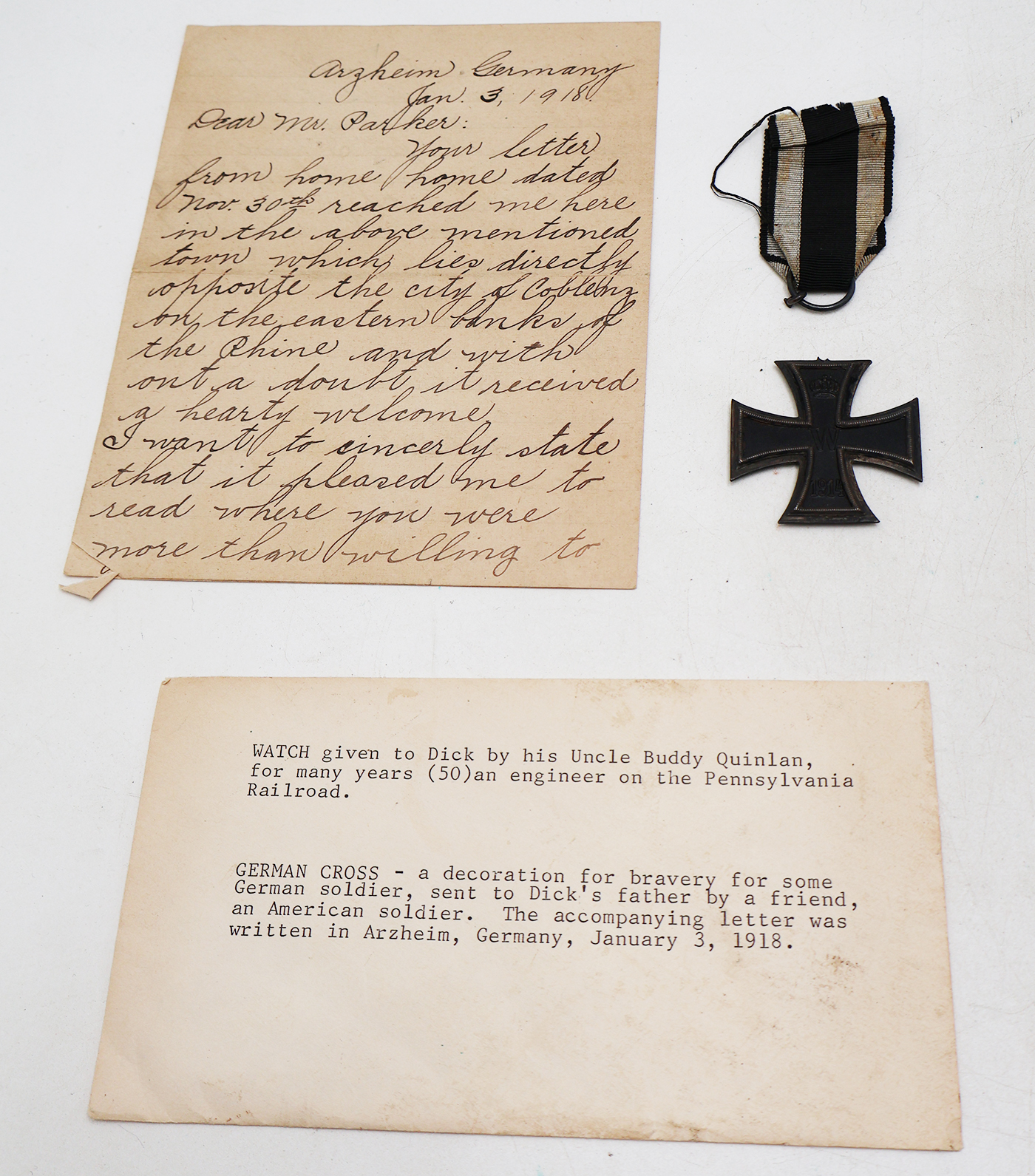 WWI era Iron Cross with US Army Capture Letters. The ring at the top of the iron cross had broken off and is attached to the ribbon. The ribbon is intact and has some staining. There are two letters one is a typed note that states the origin of the cross and handwritten note. The letter also mentioned a watch that is not with this grouping. The handwritten letter is January 3rd 1918 dated and was sent home with the cross. The doughboy who sent the letter was part of the 308th Engineers. Both letters are in good condition.