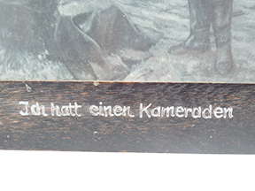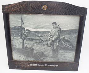 WWI era German 1914 Dated Fallen Soldier Commemoration Painting. Measures 13 x 12 inches. Frame and image is in good condition with some wear from age. Bottom of the frame says, "I once had a Comrade."