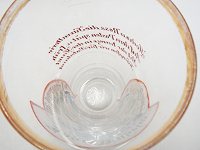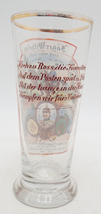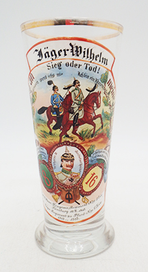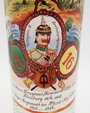 WWI Imperial German 8th Jager Regiment Hand Painted Beer Glass. Slightly over seven inches tall. Thick glass body. Has a hand painted image of the Kaiser and men on horseback. Image is super clean and in good shape. Painted on reverse is the regimental motto. Shows minor use.