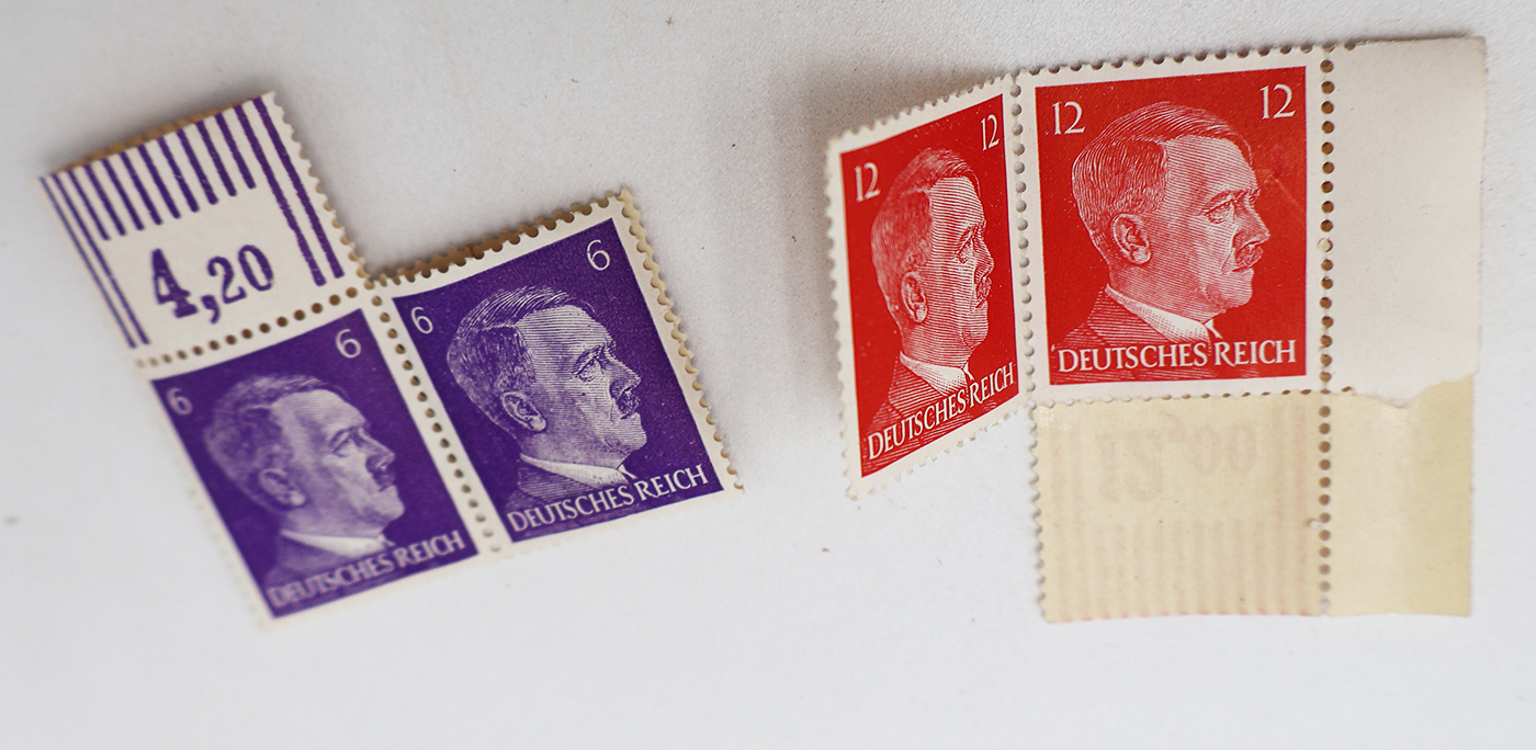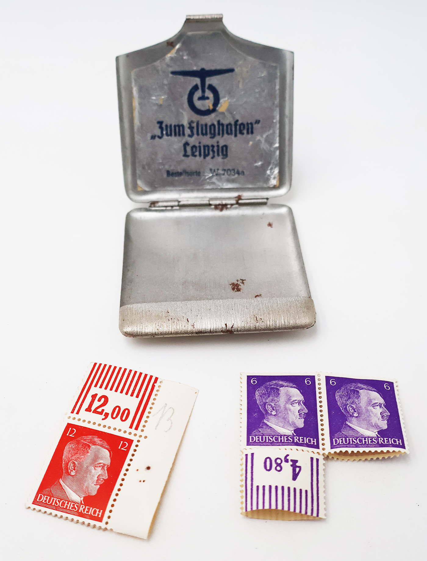 WWII era Hitler Stamp set and Tin. Comes with 7 stamps, all of which are in good condition. The tin is believed to be a sweets or gum tin from Leipzig airport. Tin is in good condition with no notable wear.