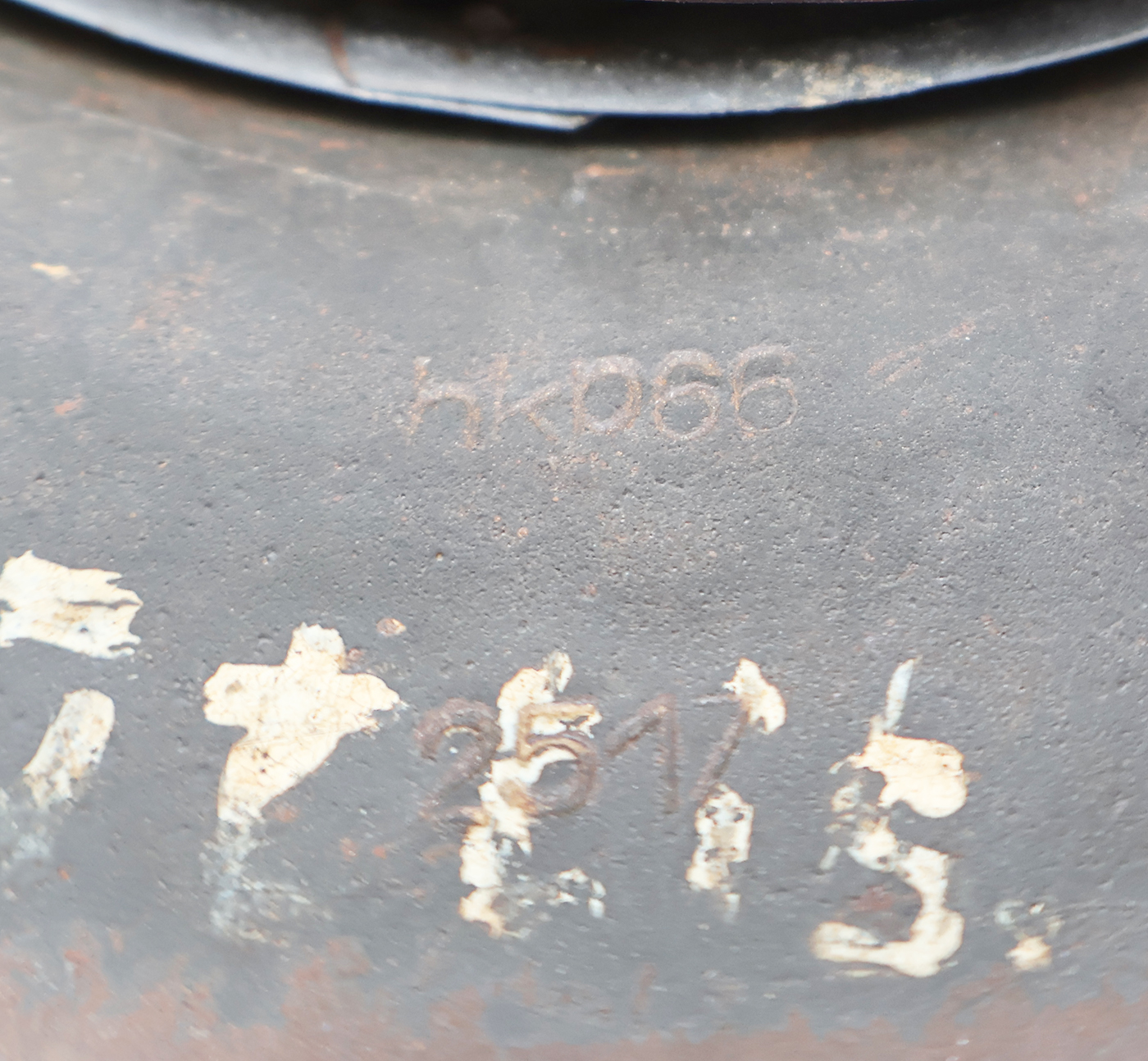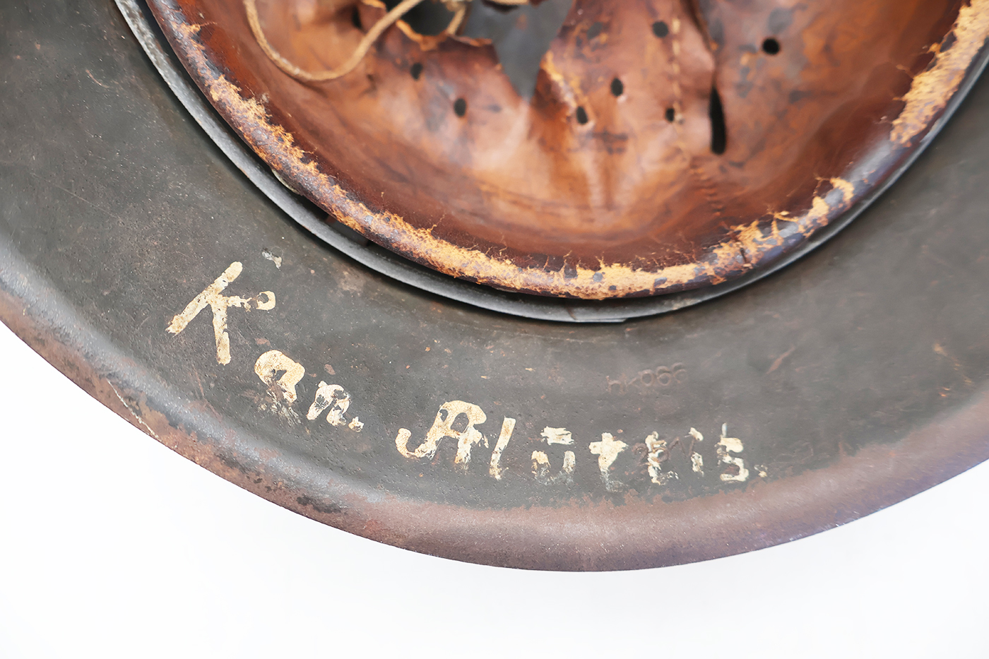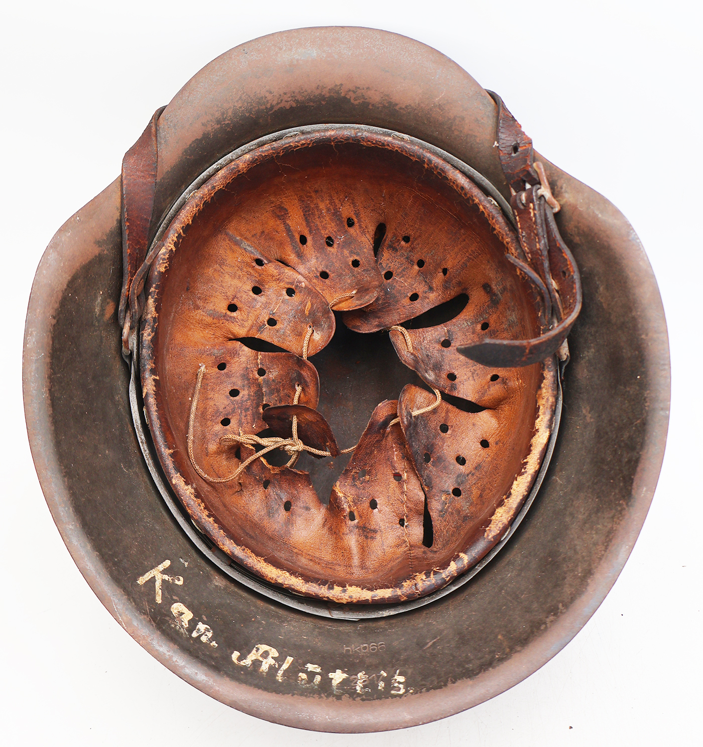 WWII M42 German Helmet. The shell is in solid condition with minor dents, scratches and some surface rust. Has a dark blue/black paint job, suggesting possibly a Luftwaffe Helmet There is no cracking or holes in the metal. The liner is pretty dry in spots with a few parts torn off, but overall intact. Helmet is named and has HKP66 and 2517 stamps on it.