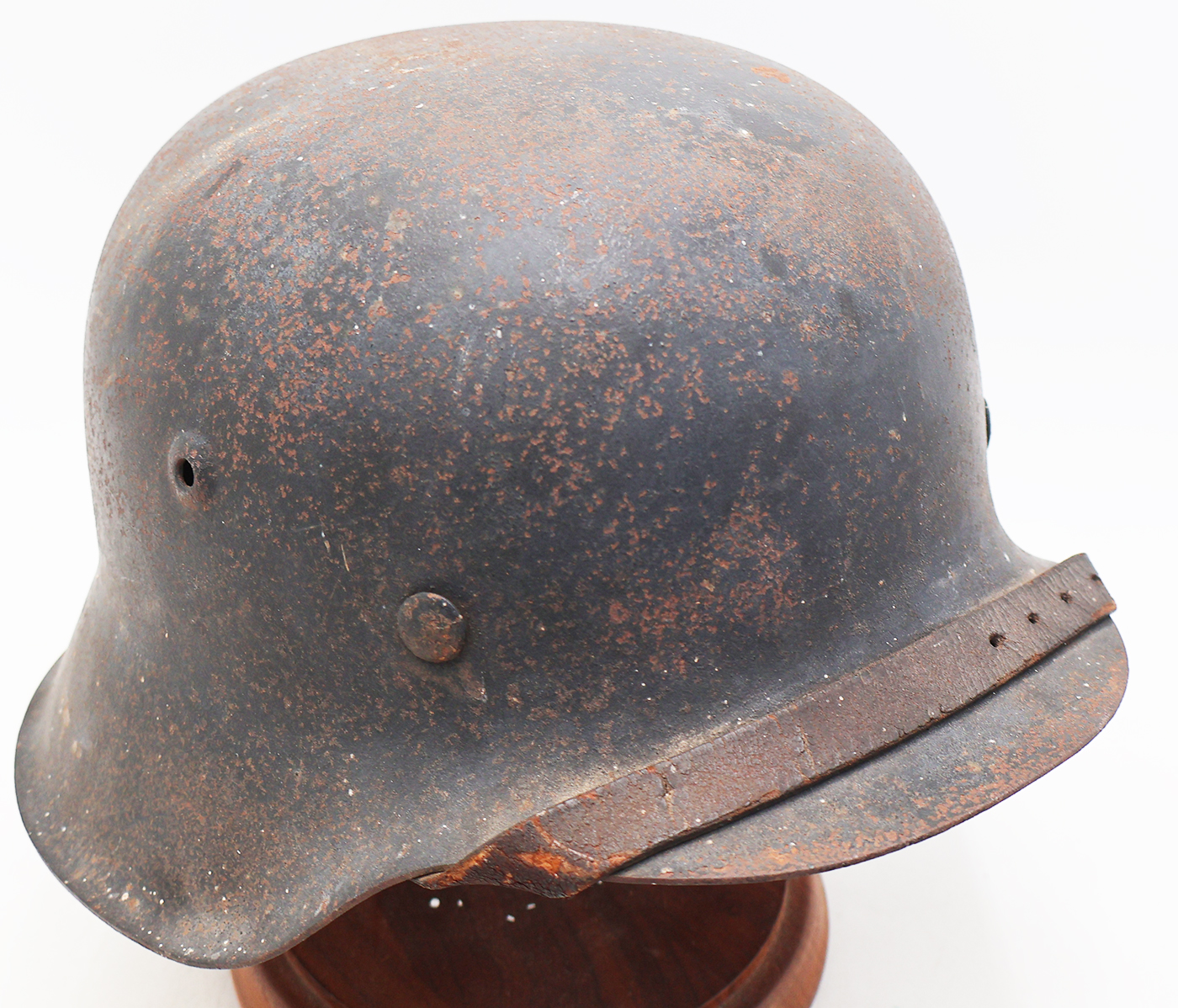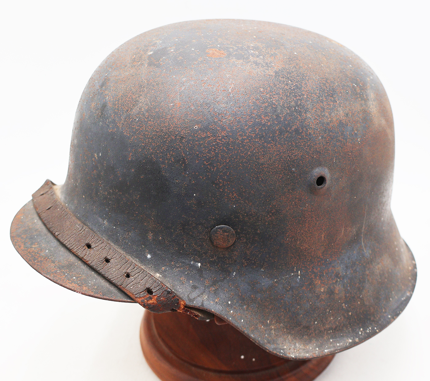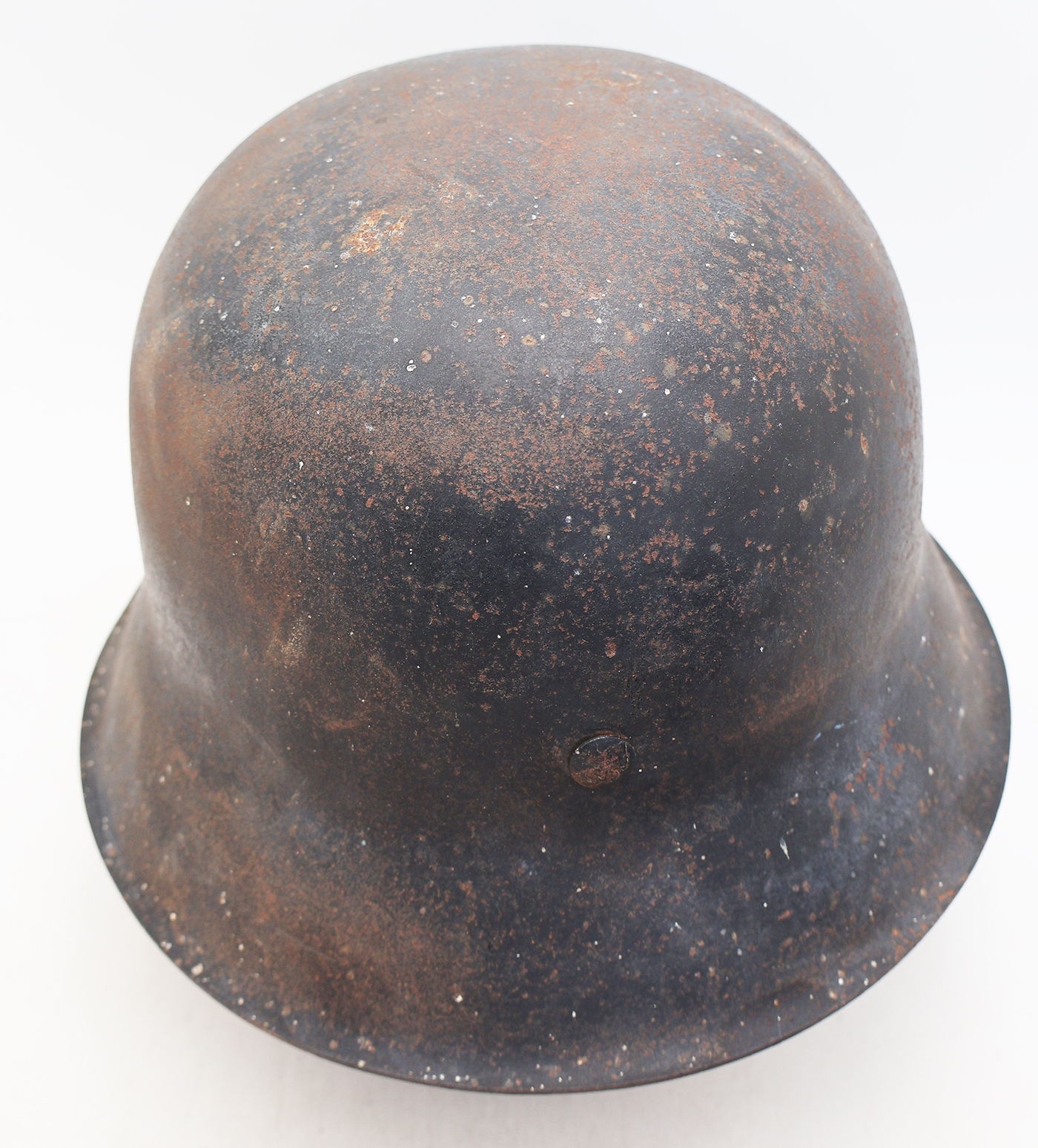 WWII M42 German Helmet. The shell is in solid condition with minor dents, scratches and some surface rust. Has a dark blue/black paint job, suggesting possibly a Luftwaffe Helmet There is no cracking or holes in the metal. The liner is pretty dry in spots with a few parts torn off, but overall intact. Helmet is named and has HKP66 and 2517 stamps on it.
