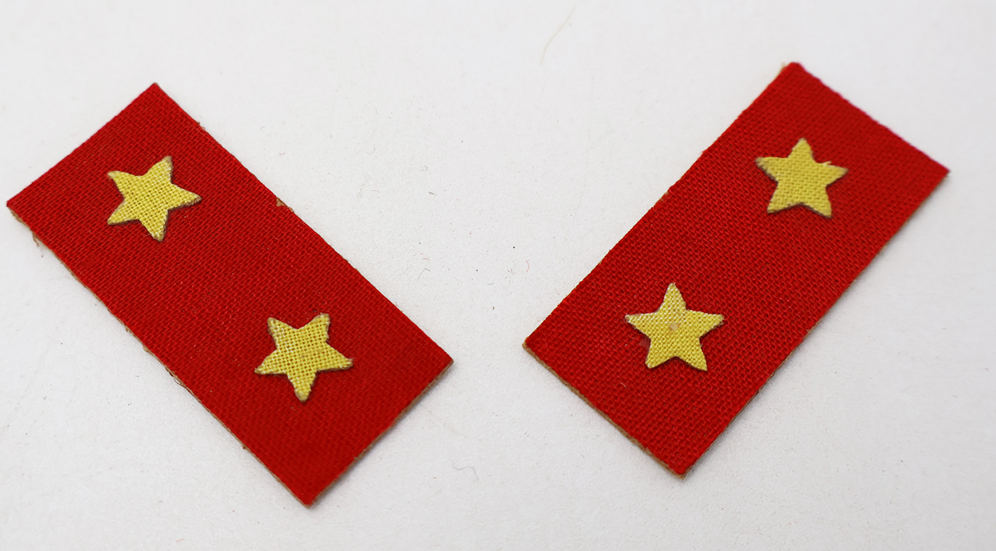 WWII Japanese Army 1st Class Private Enlisted Collar Tab Set. In good condition with no notable wear or staining. Cotton material with stiff, cardboard backing. Each tab is about a inch and three-quarters long.