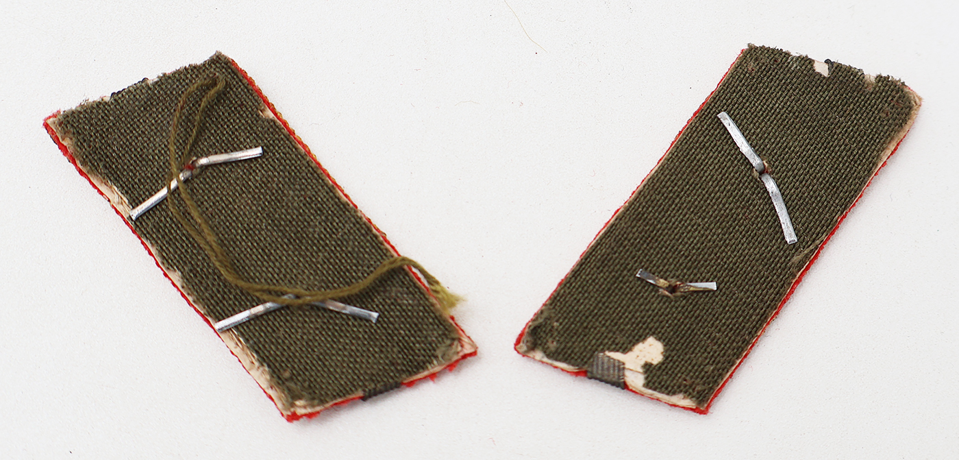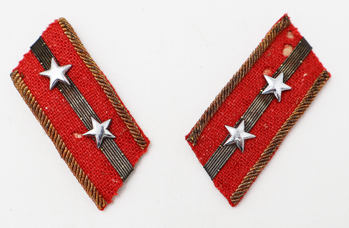 WWII Japanese Army 1st Lieutenant Officers Collar Tab Set. Worn and with some mothing. Each tab is about a inch and three-quarters long. Red woven material with gold bullion over a stiff backing.