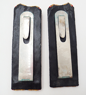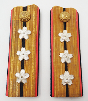 WWII Imperial Japanese Navy Medical Lieutenant Shoulder Boards. About five inches tall. Black wool body with a gold bullion stripe down the center with red striping as well. Has three silver colored metal mums attached. The back is leather covered, with a single metal band. Very good condition with some wear from age.
