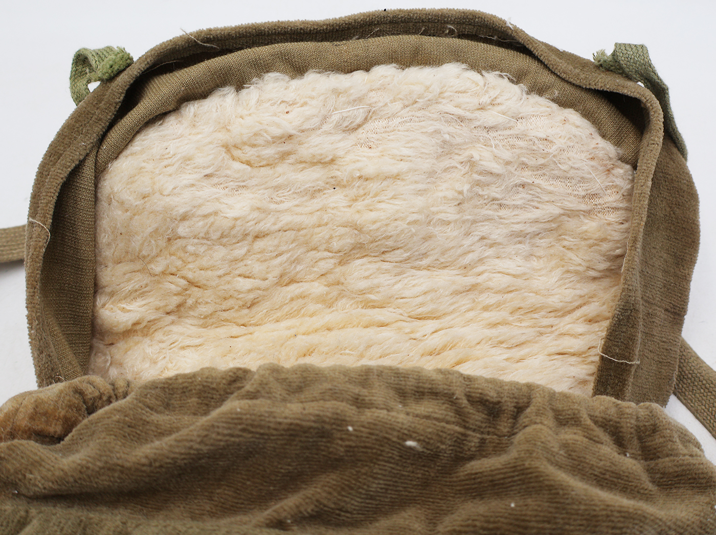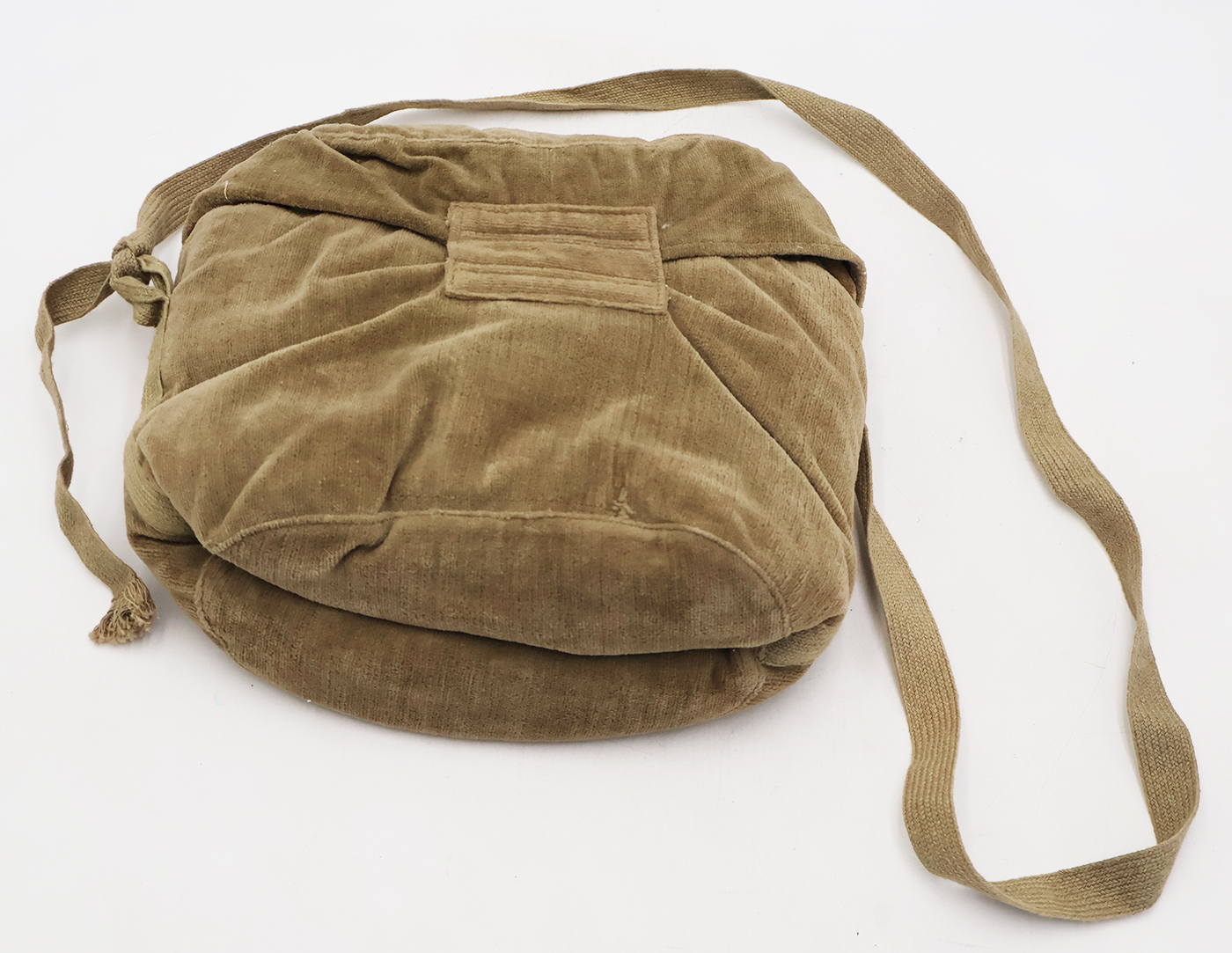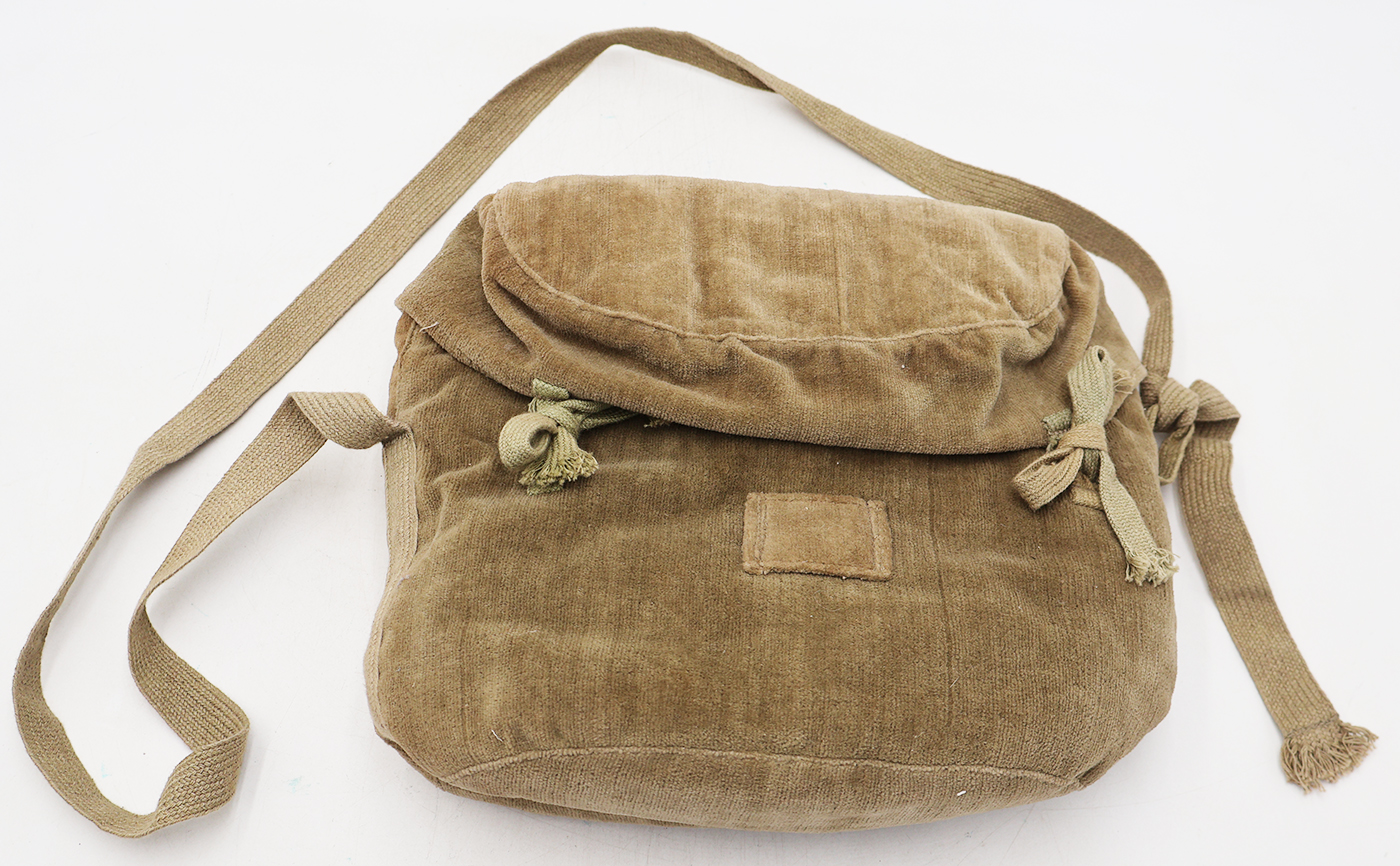 WWII Japanese Army China Front Corduroy Mess Kit Carrier. Corduroy body that is lined in a longer hair fur (similar to a China Front overcoat). Some of the fur is starting to fall out. Closure ties and the shoulder strap are in very good condition. Carrier appears unused.