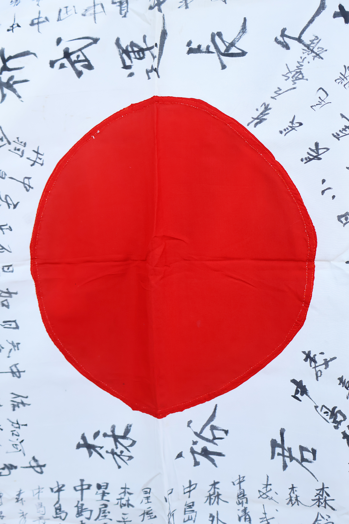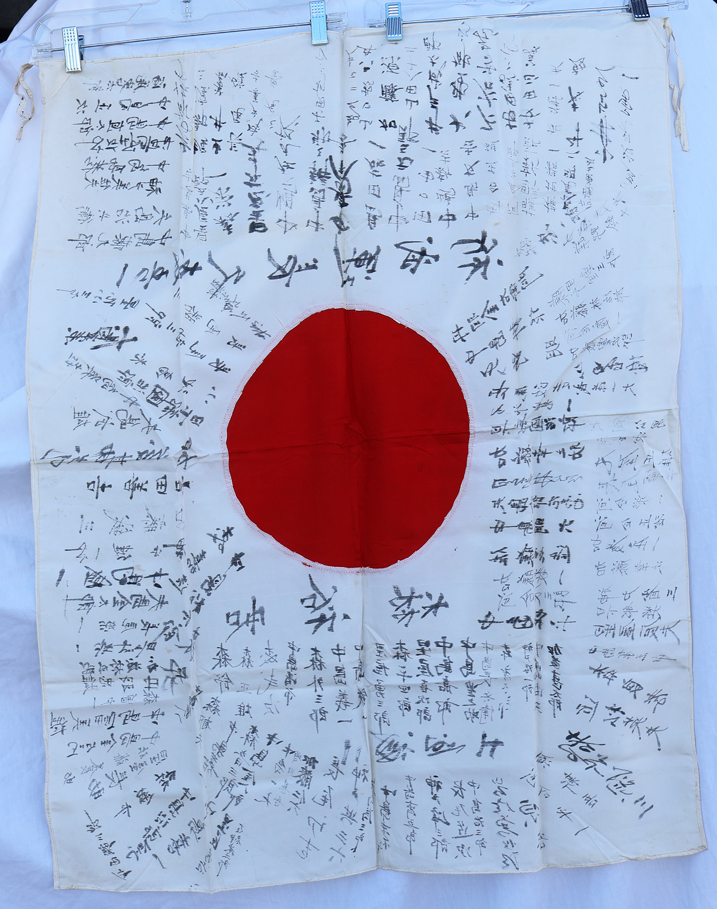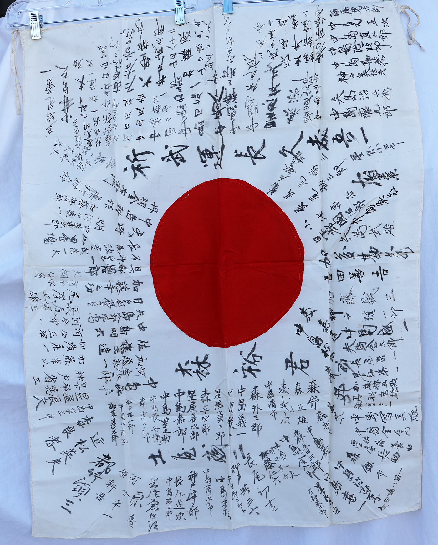 WWII Japanese Identified Mr Yu Moriv Good Luck For Bravery Flag. Named to a Mr Yu Mori. Ties are in good shape. Silk body is clean and in good condition. Measures about 28 x 37 inches. The majority of the writing is just signatures. Has been folded.