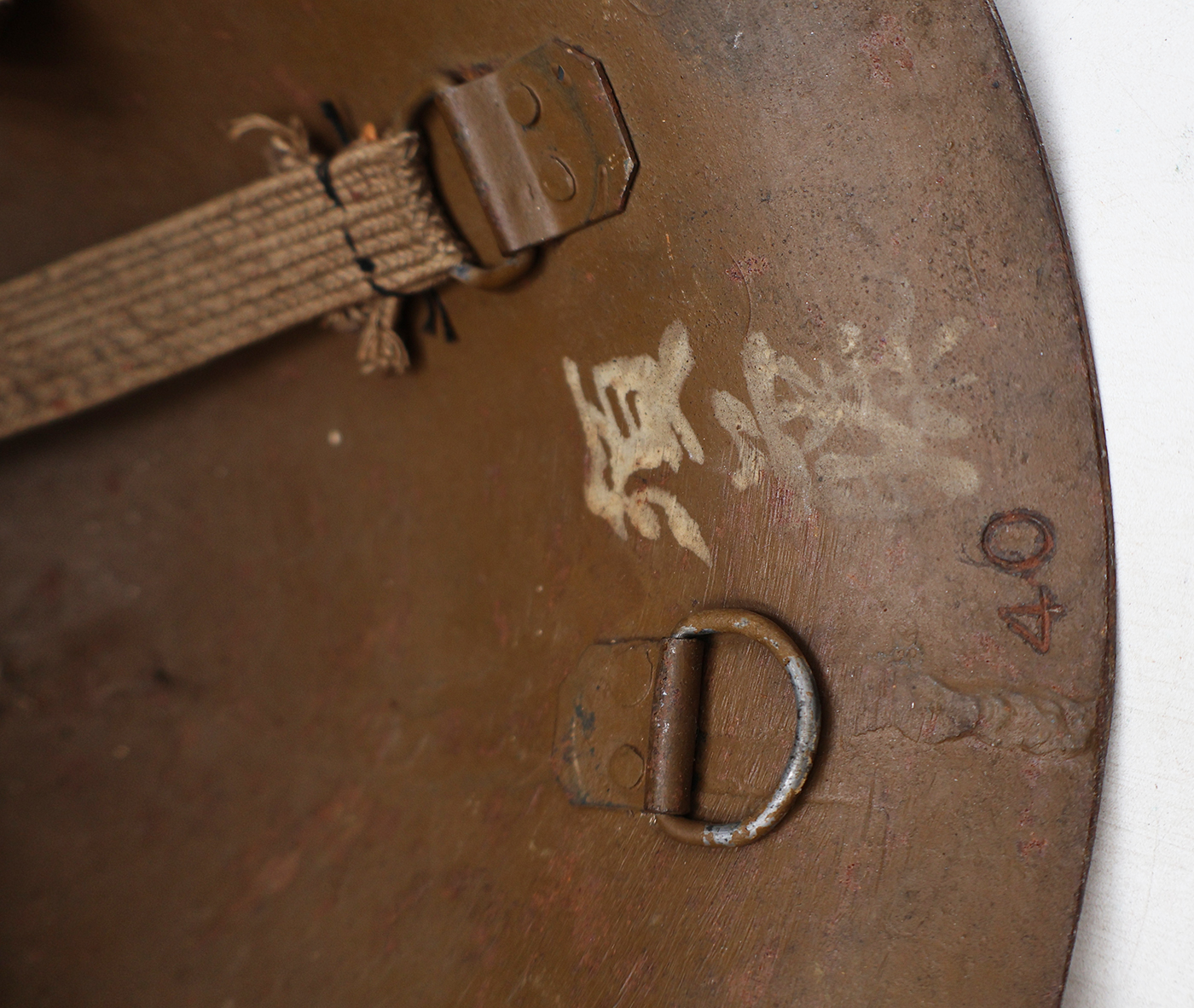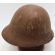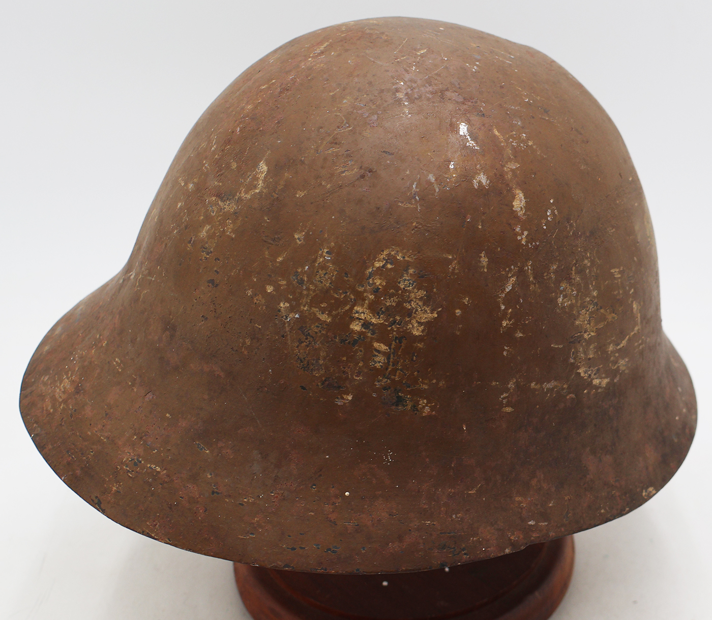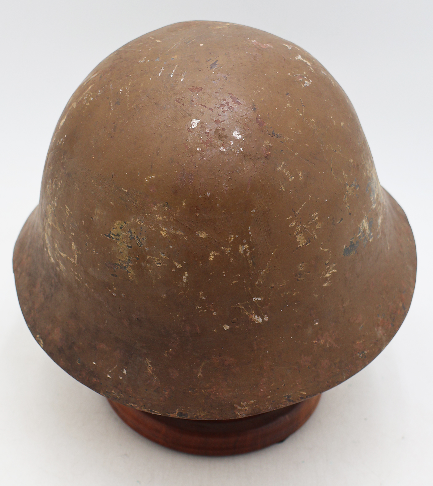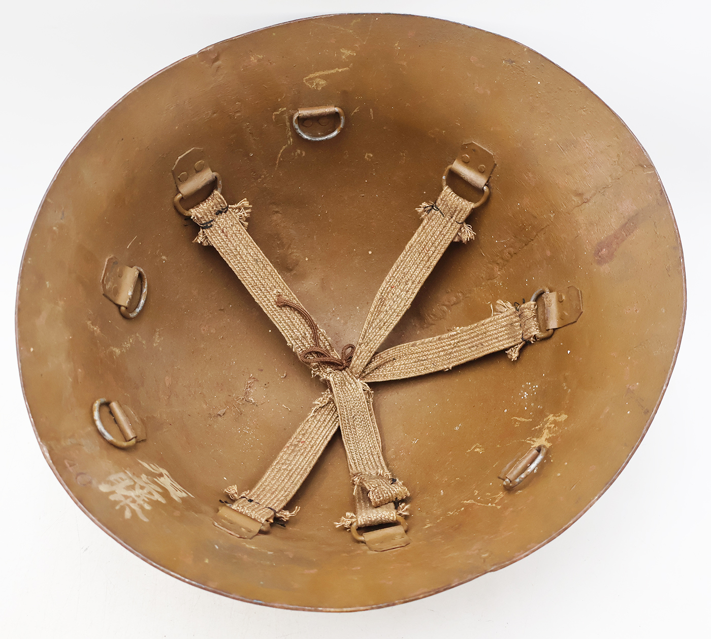 WWII Japanese Late War Homefront Helmet. Brown painted body has some wear from usage, but the body has no notable dents or damage. Has been issued and is named. Most of the liner is gone. The few straps that are still left and in decent condition.