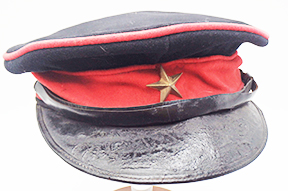Pre WWI Meiji era Japanese Army Infantry Visor Cap. Sweatband is worn from usage and age. On the front is the Army Star. The wool body in good condition with just some staining. The leather bill is dry with some cracking. The leather chinstrap is stiff, but intact. Small size.