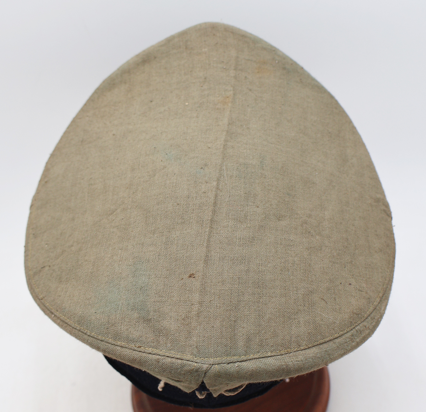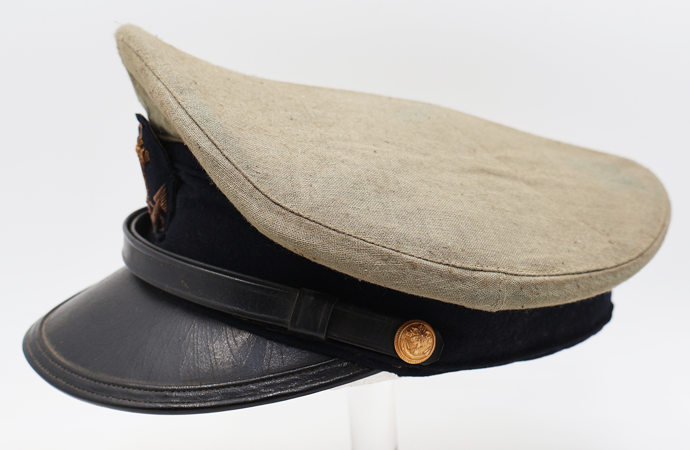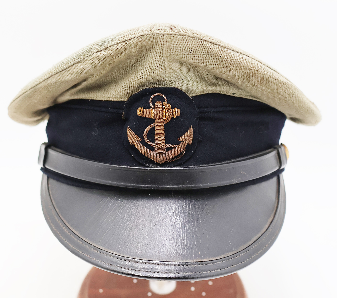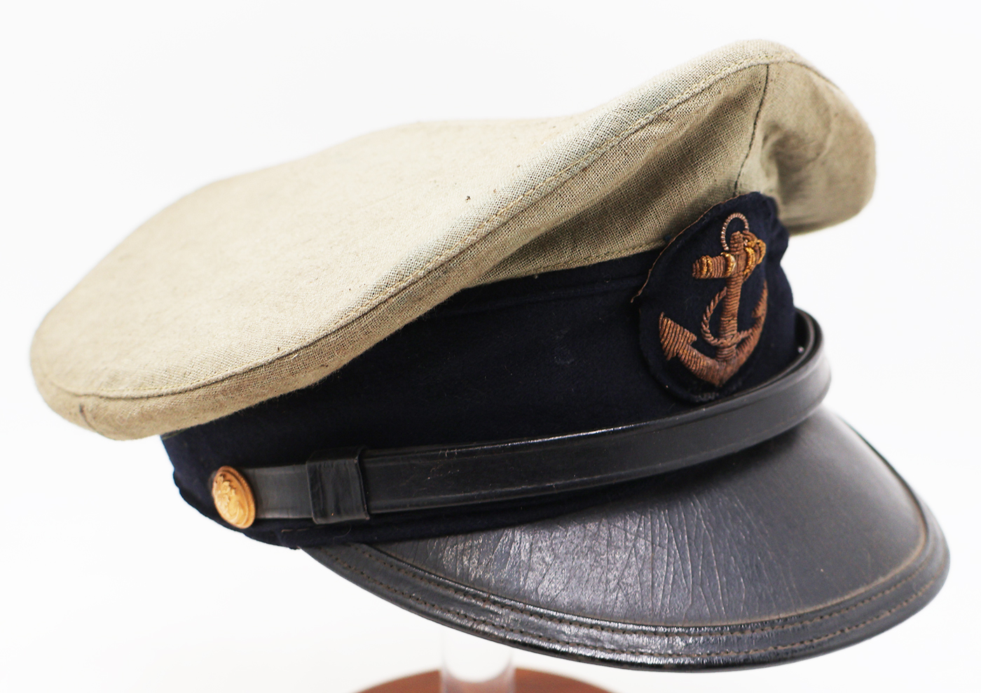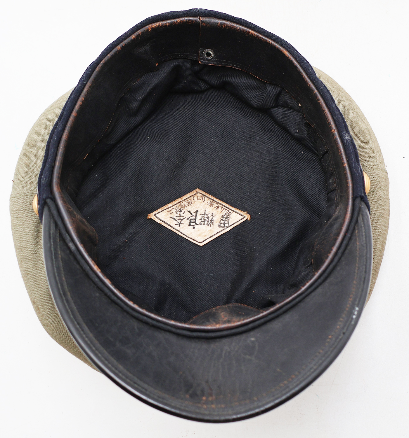 WWII Imperial Japanese Naval Cadet Visor Cap with Cover. Standard issue blue wool visor hat with green cover. Has the heavy gold bullion embroidered cap badge. Bill has some wear, but is intact. Has the name inside to Mr. Kirana. Shows use but still in nice shape. Small size. Cover is in great shape.