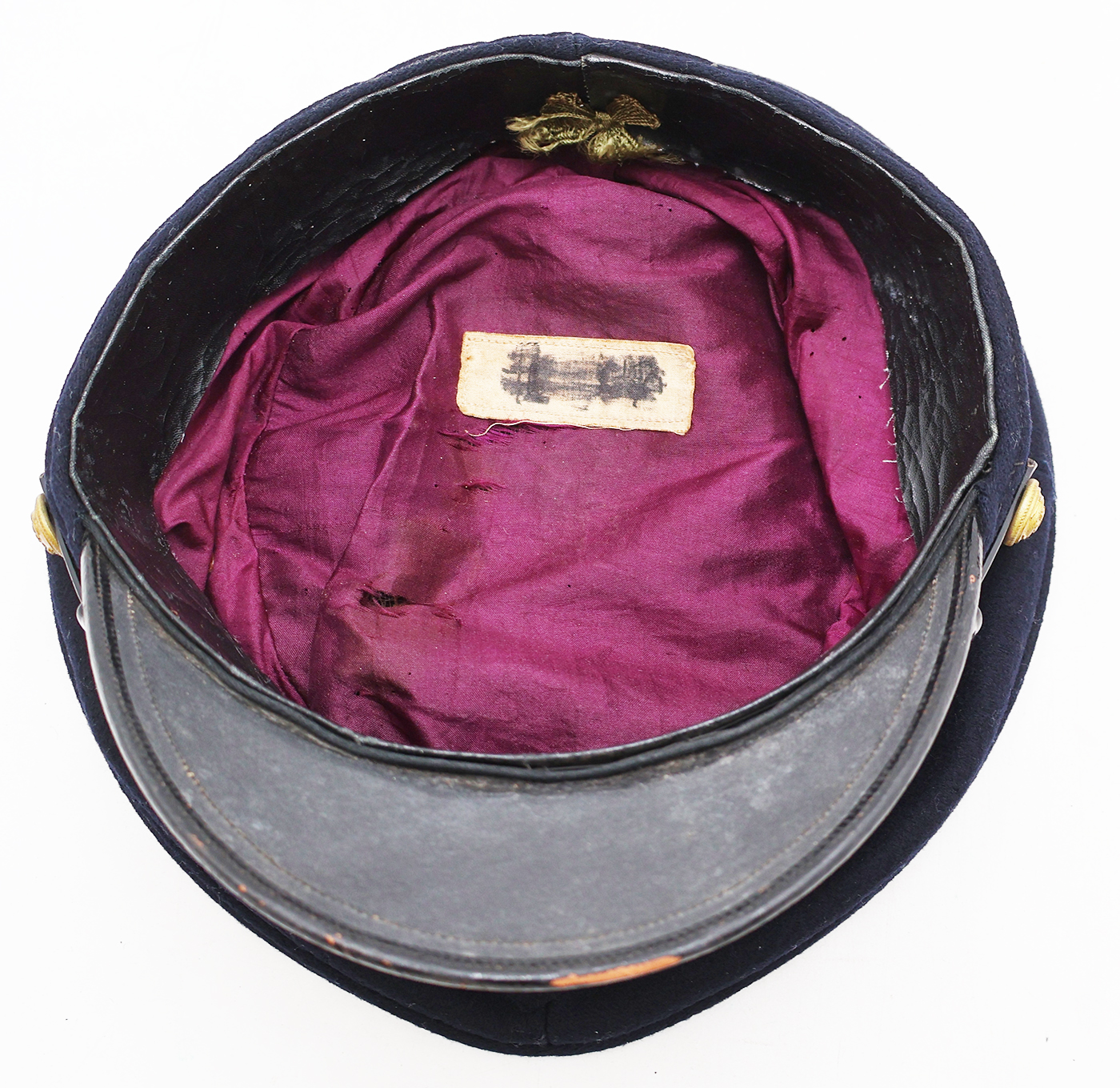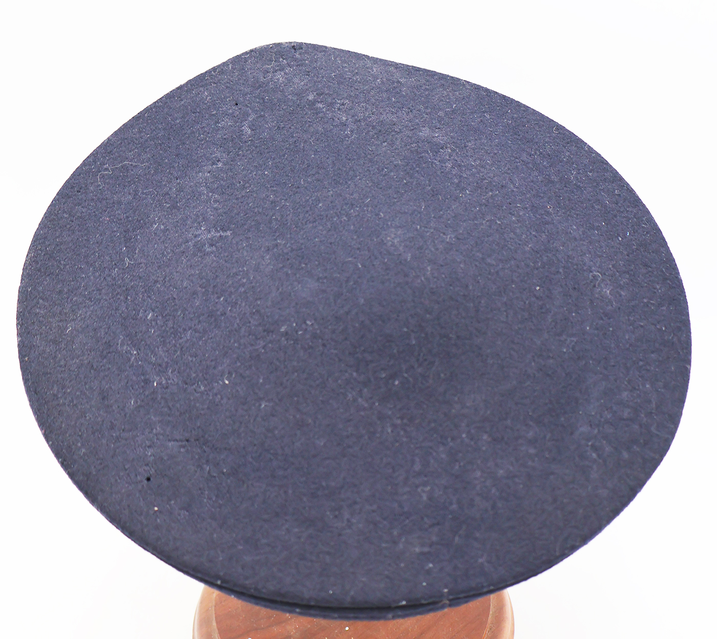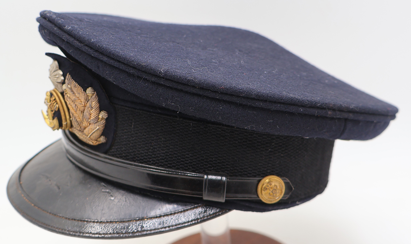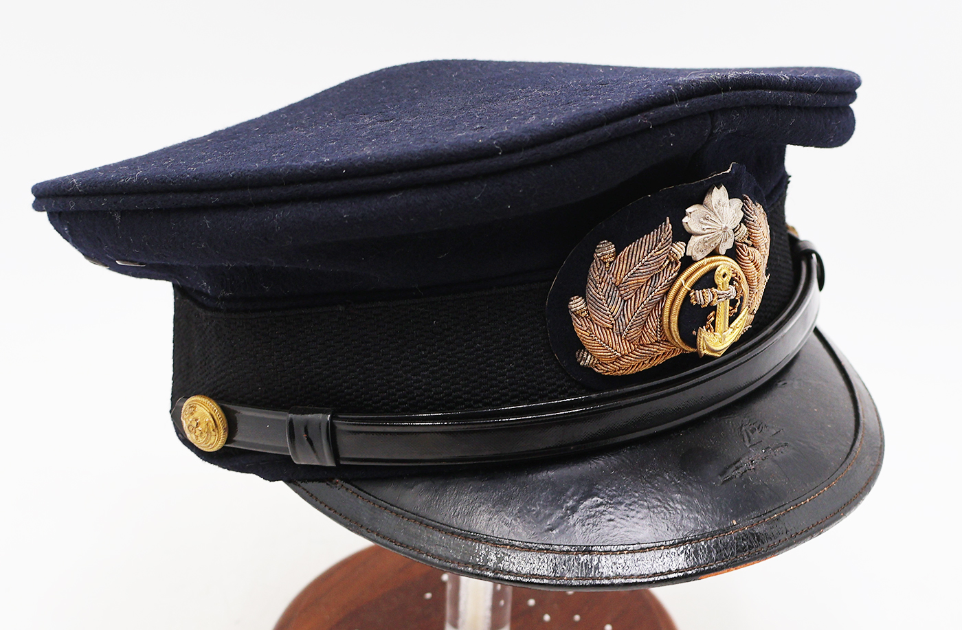 WWII Imperial Japanese Naval Officers Blue Wool Visor Hat. Standard issue blue wool covered visor hat. Has the heavy gold bullion embroidered cap badge. Liner has some wear , but overall in good condition. Bill has some wear, but is intact. Shows use but still in nice shape. Small size.