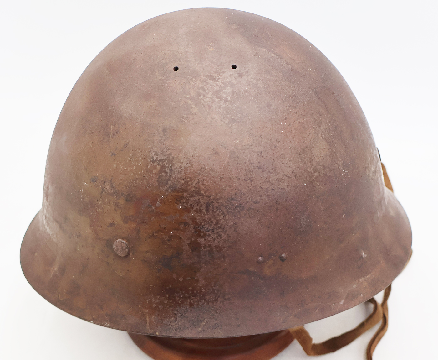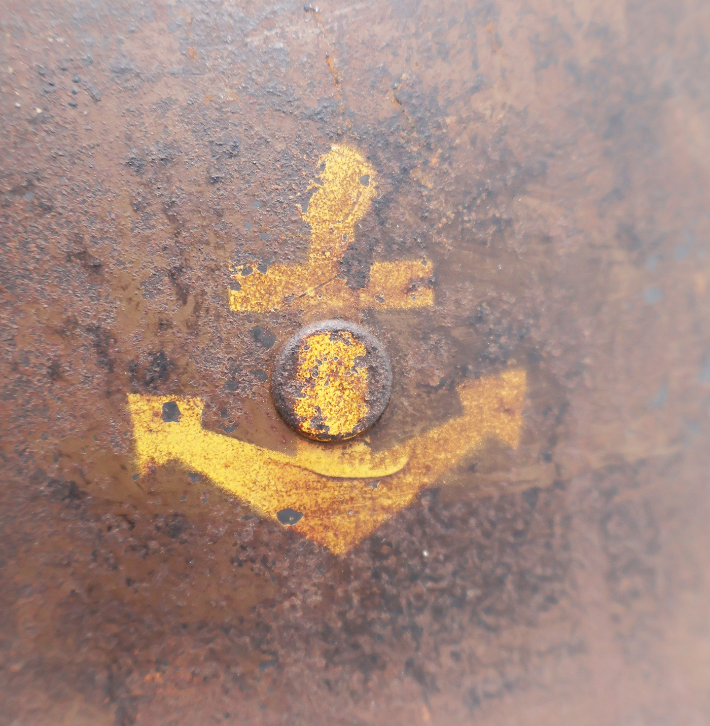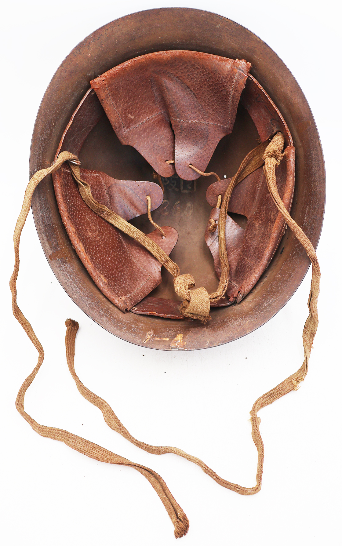 WWII Japanese Navy Helmet. The shell is in solid condition with minor dents, scratches and some surface rust. Has a dark brown paint job with a yellow anchor painted on it. There is no cracking or holes in the metal. The liner is dry in spots, but overall is pretty supple and intact. Helmet has makers painted on the inside stating that it was part of Osaka Group. This was a Navy Coastal Artillery unit based out of the Yura Fortress guarding Osaka. A super rare piece.