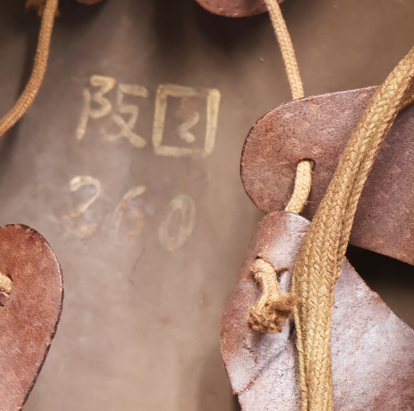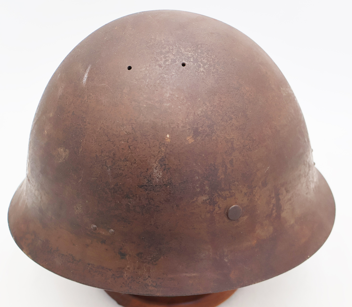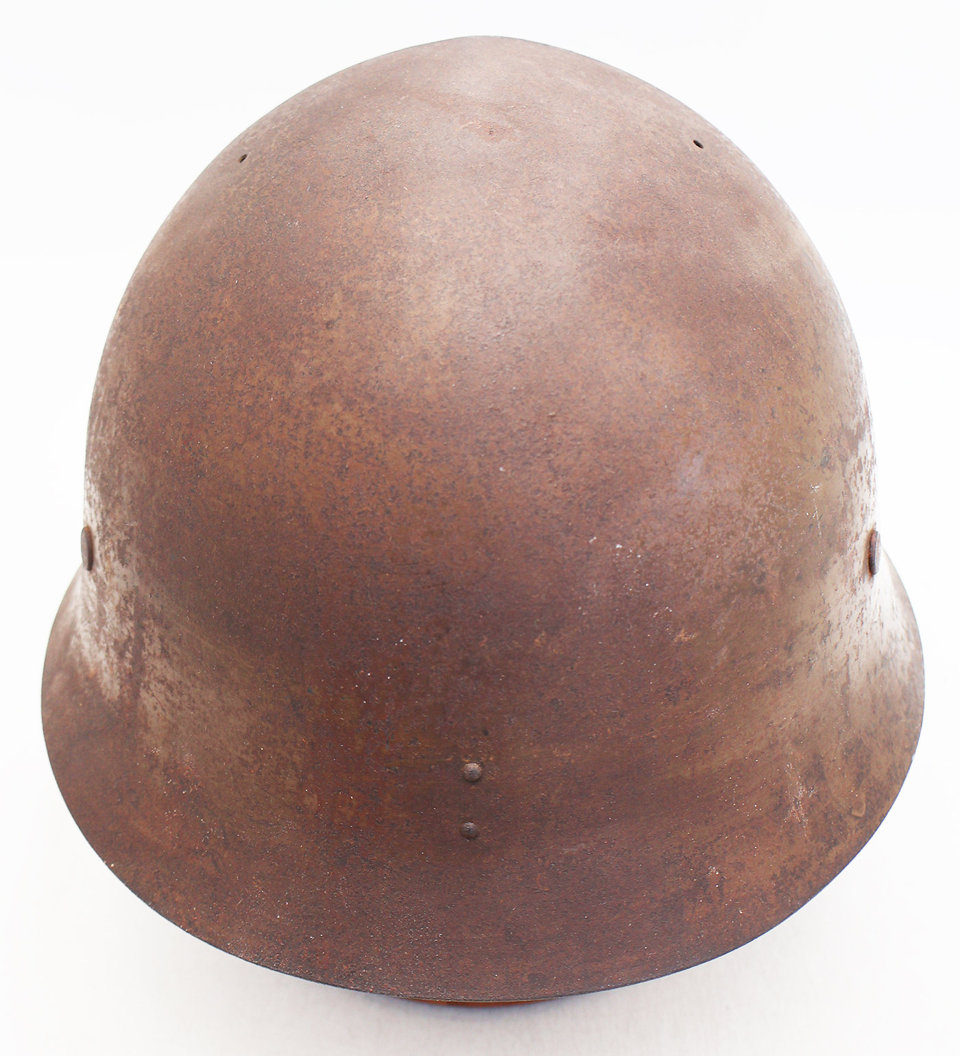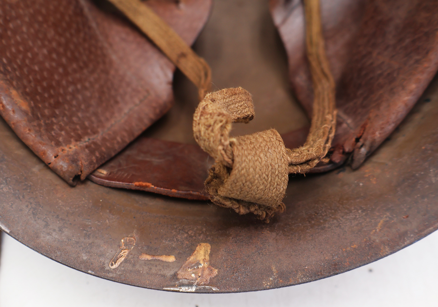 WWII Japanese Navy Helmet. The shell is in solid condition with minor dents, scratches and some surface rust. Has a dark brown paint job with a yellow anchor painted on it. There is no cracking or holes in the metal. The liner is dry in spots, but overall is pretty supple and intact. Helmet has makers painted on the inside stating that it was part of Osaka Group. This was a Navy Coastal Artillery unit based out of the Yura Fortress guarding Osaka. A super rare piece.
