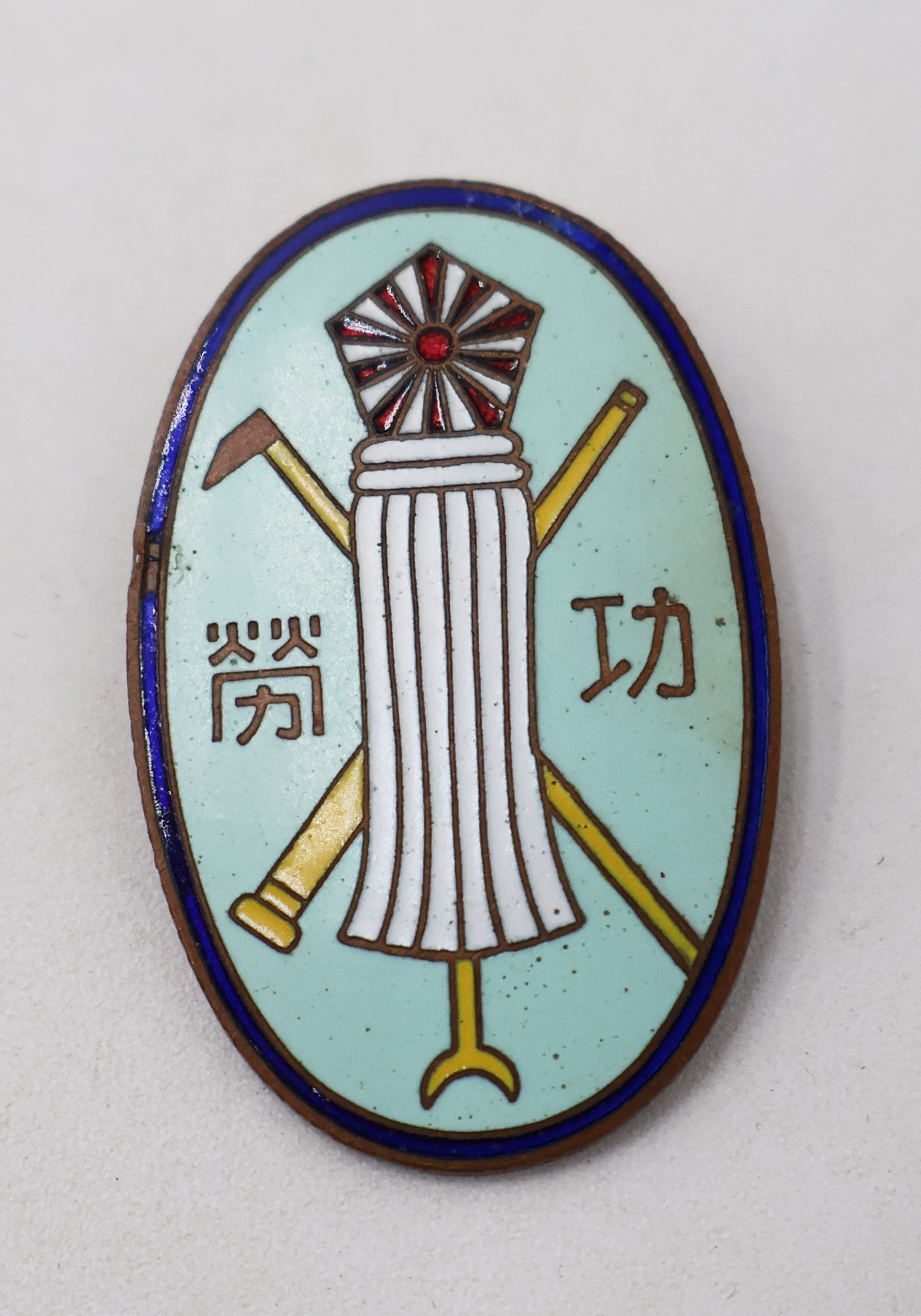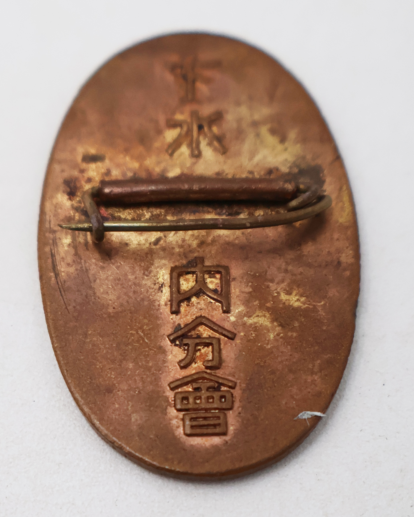 WWII Japanese Homefront Fire Brigade Merit Badge. Enamel face is in good shape with minor wear from age. Brass body and pinback are in good shape. Measures one and a half inches tall.