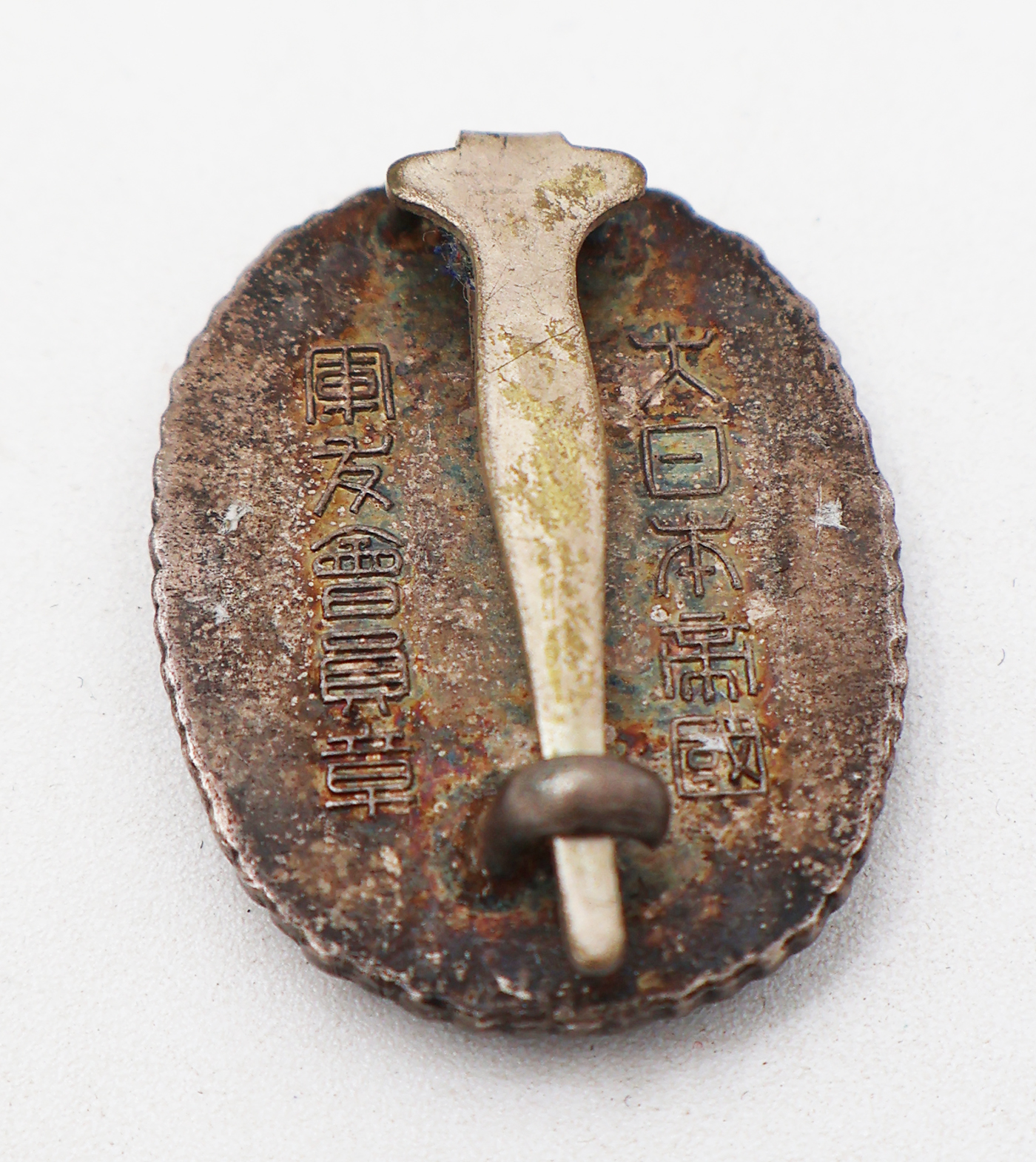 WWII era Japanese Military Association Membership Badge. Aluminum body has some minor wear from age. About 1 inch tall. Face and clasp are in good condition.