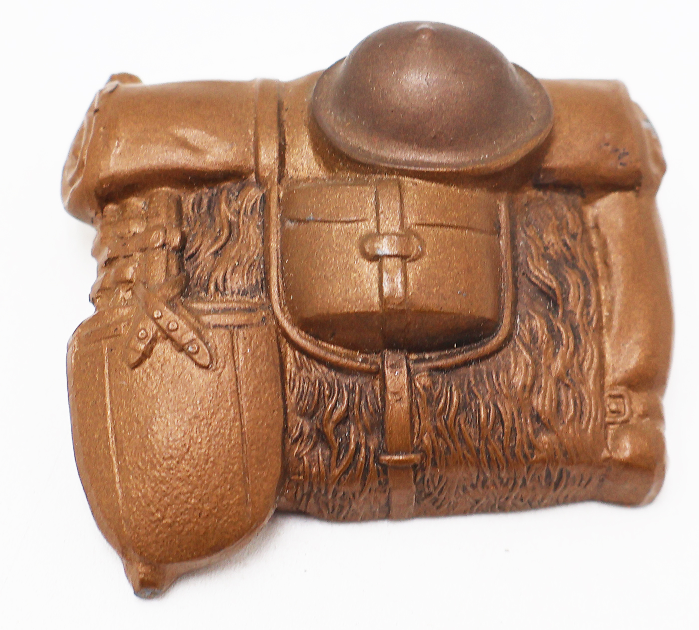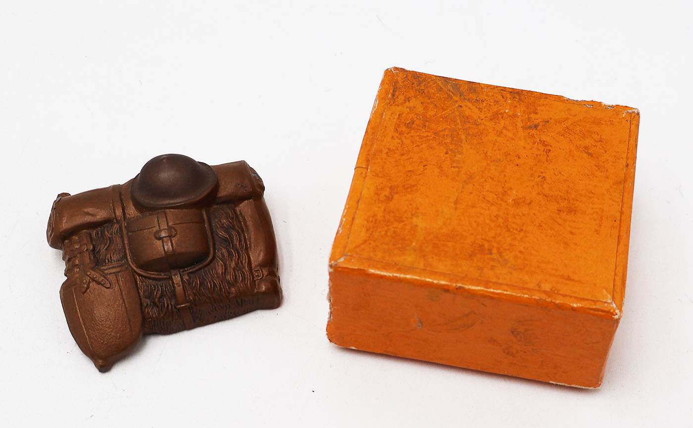 WWII era Japanese Army Pack Paperweight. Brass paperweight is in good shape with just minor wear from age. Box is heavily worn, but overall intact.