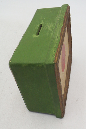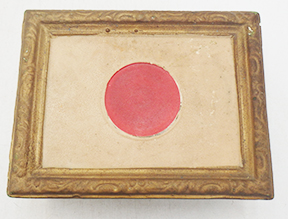 WWII Japanese Homefront Flag Ceramic Bank. About four inches tall. Hand painted. Body is in good shape. Shows the image of the national flag. Paint shows some storage wear. Missing the stopper.