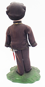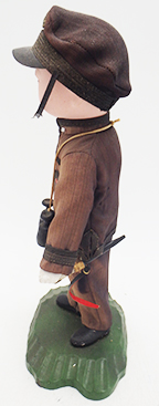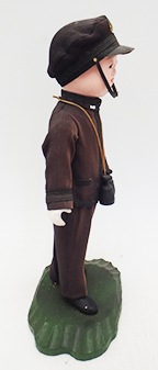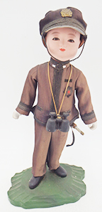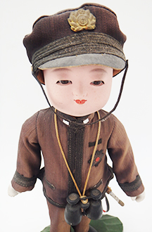 Early WWII Japanese Navy Officer Porcelain Doll. About 10 inches tall. Cloth uniform is in good condition with no notable damage and only minor wear and staining. Porcelain body has some cracking on the left leg, but supports itself well. Sword, belt and accessories are all in good condition. Wooden stand is in great shape. Amazing to see a piece like this still in such good condition.